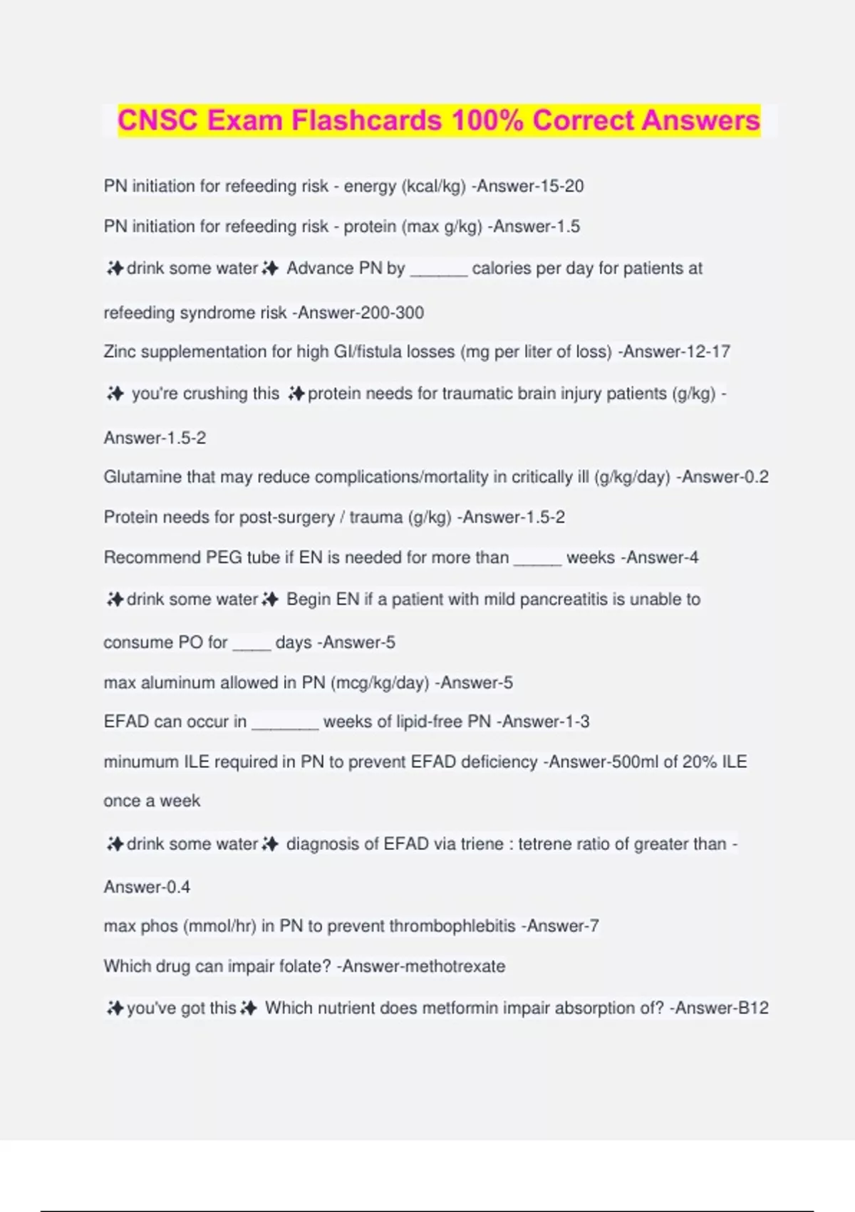 CNSC Exam Flashcards 100% Correct Answers PN initiation for refeeding risk - energy (kcal/kg) -Answer-15-20 PN initiation for refeeding risk - protein (max g/kg) -Answer-1.5 drink some water Advance PN by ______ calories per day for patients at refeeding syndrome risk -Answer-200-300 Zinc supplementation for high GI/fistula losses (mg per liter of loss) -Answer-12-17 you're crushing this protein needs for traumatic brain injury patients (g/kg) - Answer-1.5-2 Glutamine that may reduce complications/mortality in critically ill (g/kg/day) -Answer-0.2 Protein needs for post-surgery / trauma (g/kg) -Answer-1.5-2 Recommend PEG tube if EN is needed for more than _____ weeks -Answer-4 drink some water Begin EN if a patient with mild pancreatitis is unable to consume PO for ____ days -Answer-5 max aluminum allowed in PN (mcg/kg/day) -Answer-5 EFAD can occur in _______ weeks of lipid-free PN -Answer-1-3 minumum ILE required in PN to prevent EFAD deficiency -Answer-500ml of 20% ILE once a week drink some water diagnosis of EFAD via triene : tetrene ratio of greater than - Answer-0.4 max phos (mmol/hr) in PN to prevent thrombophlebitis -Answer-7 Which drug can impair folate? -Answer-methotrexate you've got this Which nutrient does metformin impair absorption of? -Answer-B12 Which minerals can ETOH increase excretion of? -Answer-calcium and magnesium Which essential nutrients besides B vitamins are water-soluble? -Answer-vitamin C and choline What are the essential trace minerals? -Answer-iron, zinc, copper, manganese, selenium, chromium drink some water Where is B12 absorbed? -Answer-ileum Fiber RDA (grams per 1000kcal) -Answer-14 Fiber RDA (children) -Answer-age +5 Free water deficit calculation -Answer-TBW (kg) [(Na-140) / 140] How long does the catabolic phase of critical illness last in days? -Answer-7-10 you've got this Half life of albumin in days -Answer-14-20 RQ for mixed diet -Answer-0.85 RQ for underfeeding -Answer-0.82 RQ for overfeeding -Answer-1.0 normal pH -Answer-7.35-7.45 hyponatremia (less than _____ mEq/L) -Answer-135 you're crushing this appropriate Na correction (mEq/L/day) -Answer-10 hypernatremia (greater than _____ mEq/L) -Answer-145 is D5W isotonic or hypotonic -Answer-Isotonic in the bag; hypotonic once metabolized What increases CO2 production and can worsen acidosis (underfeeding or overfeeding)? -Answer-overfeeding physiologic RQ -Answer-0.7-1 ideal RQ (protein sparing; mixed CHO/FAT metabolism) -Answer-0.85-0.95 Protein RQ -Answer-0.8 you're crushing this Fat RQ -Answer-0.7 Mixed substrate RQ -Answer-0.85 Carbohydrate RQ -Answer-1.0 Dextrose mOsm/g -Answer-5 you've got this Amino acids mOsm/g -Answer-10 Electrolytes mOsm/g -Answer-1-2 Lipid mOsm/g (30% ILE) -Answer-0.67 Carbemazepine (Tegretol) -Answer-Anti-convulsant; hold EN 2 hours before and after Fluoroquinolones -Answer-Drugs that end in -floxacin (hold EN 1 hour before and after) you're crushing this Isotonic EN formula (mOsm/kg) -Answer-300 French size of enteric tube to use for blenderized formula -Answer-14 You can use a PEG tube _____ hours after placement -Answer-2-4 Very low birthweight baby, under _______ grams -Answer-2500 you've got this Starting GIR birth - 12 months -Answer-6-8 Max GIR birth-12 months -Answer-15 Pediatric starting GIR -Answer-6-7 drink some water Pediatric max GIR -Answer-12 Obese critically ill kcals/kg -Answer-11-14 or 22-25 of IBW When to start EN for TBI, under _______ hours -Answer-48 What kind of formula to use for trauma -Answer-immune-enhancing How much of our TBW (total body water) is extracellular? -Answer-1/3