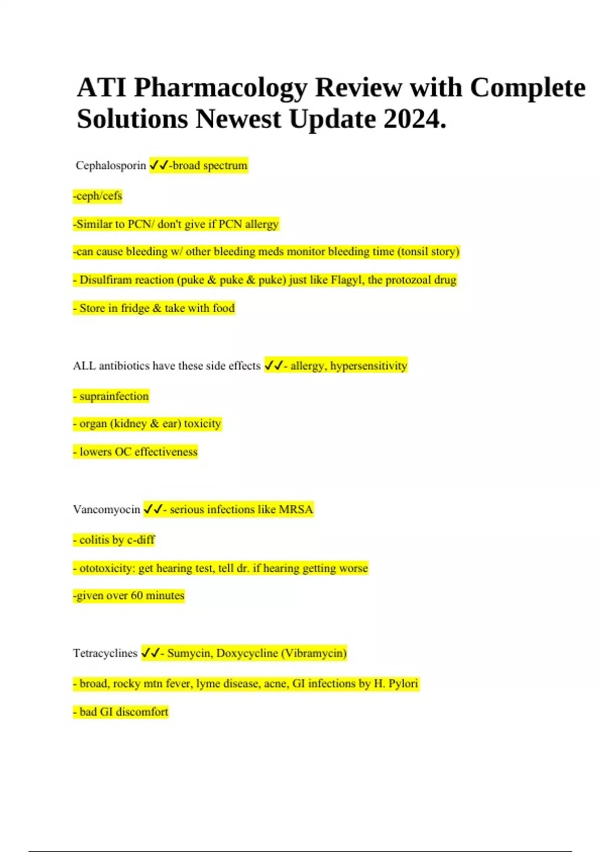 ATI Pharmacology Review with Complete Solutions Newest Update 2024. Cephalosporin -broad spectrum -ceph/cefs -Similar to PCN/ don't give if PCN allergy -can cause bleeding w/ other bleeding meds monitor bleeding time (tonsil story) - Disulfiram reaction (puke & puke & puke) just like Flagyl, the protozoal drug - Store in fridge & take with food ALL antibiotics have these side effects - allergy, hypersensitivity - suprainfection - organ (kidney & ear) toxicity - lowers OC effectiveness Vancomyocin - serious infections like MRSA - colitis by c-diff - ototoxicity: get hearing test, tell dr. if hearing getting worse -given over 60 minutes Tetracyclines - Sumycin, Doxycycline (Vibramycin) - broad, rocky mtn fever, lyme disease, acne, GI infections by H. Pylori - bad GI discomfort ATI Pharmacology Review with Complete Solutions Newest Update 2024. - Don't give to kids ≤8; teeth permanently yellow - Bad photosensitivity- wear sunscreen! - Can't take with milk, iron, or antacids - Take on empty stomach with a full glass of water When is Arythromycin given? What class of drugs is it? worse adverse effect? When pt allergic to PCN and needs abx. Bacteriostatic inhibitor bad GI issues Aminoglycosides ototoxicity, Renal toxicity, Can't take with PCN at all! - gentamicin, neomycin, streptomycin TMP-SMZ -Contains Sulfa - use for UTI - Blood problems; get CBC baseline -photosensitivity wear sunscreen and glasses! - empty stomach with a full glass of water.