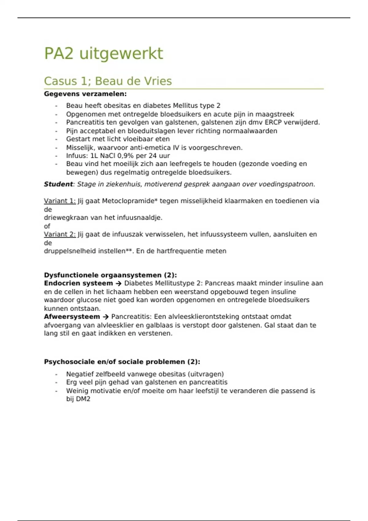 In dit document staat alles wat je nodig heb om te voor te bereiden op PA2. In dit document zijn de casussen uit leerjaar 2 voor PA2 helemaal uitgewerkt volgens criteria van het beoordelingsformulier. In dit document staat ook een afbeelding in over de verschillende orgaansystemen die je moet kennen voor het PA. Ook staat er een opsomming van alle punten die je moet verwerken in het gesprek met de zorgvrager. Kortom alle kennis die je moet hebben voor het PA staat hierin. LET OP! (de casussen kunnen per jaar veranderen dus check goed of je dezelfde casussen hebt, echter meestal als er iets veranderd komen ze alsnog vaak overeen). Mocht je andere casus(sen) hebben is het alsnog een goed voorbeeld van hoe je de casus kan uitwerken en de orgaansystemen en het gesprek met de zorgvrager blijven natuurlijk hetzelfde dus daar heb je altijd wat aan.