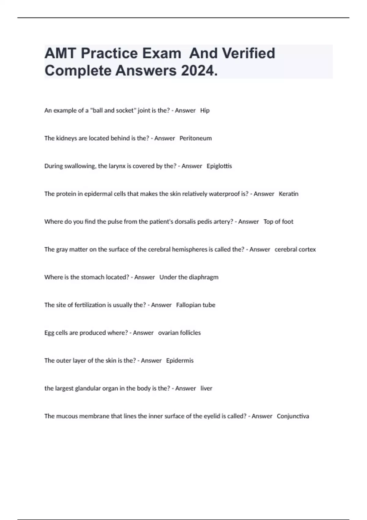 An example of a "ball and socket" joint is the? - Answer Hip The kidneys are located behind is the? - Answer Peritoneum During swallowing, the larynx is covered by the? - Answer Epiglottis The protein in epidermal cells that makes the skin relatively waterproof is? - Answer Keratin Where do you find the pulse from the patient's dorsalis pedis artery? - Answer Top of foot The gray matter on the surface of the cerebral hemispheres is called the? - Answer cerebral cortex Where is the stomach located? - Answer Under the diaphragm The site of fertilization is usually the? - Answer Fallopian tube Egg cells are produced where? - Answer ovarian follicles The outer layer of the skin is the? - Answer Epidermis the largest glandular organ in the body is the? - Answer liver The mucous membrane that lines the inner surface of the eyelid is called? - Answer Conjunctiva