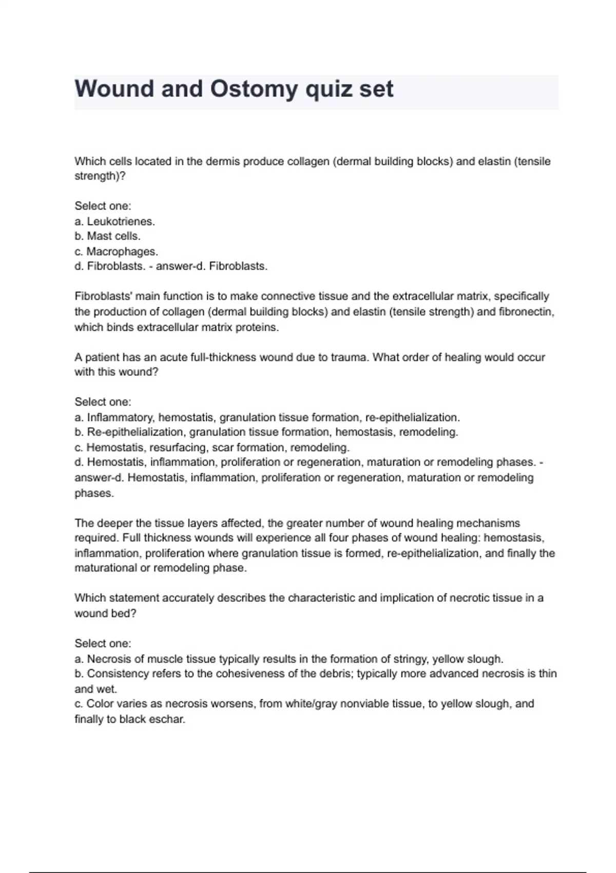 Which cells located in the dermis produce collagen (dermal building blocks) and elastin (tensile strength)? Select one: a. Leukotrienes. b. Mast cells. c. Macrophages. d. Fibroblasts. - answer-d. Fibroblasts. Fibroblasts' main function is to make connective tissue and the extracellular matrix, specifically the production of collagen (dermal building blocks) and elastin (tensile strength) and fibronectin, which binds extracellular matrix proteins. A patient has an acute full-thickness wound due to trauma. What order of healing would occur with this wound? Select one: a. Inflammatory, hemostatis, granulation tissue formation, re-epithelialization. b. Re-epithelialization, granulation tissue formation, hemostasis, remodeling. c. Hemostatis, resurfacing, scar formation, remodeling. d. Hemostatis, inflammation, proliferation or regeneration, maturation or remodeling phases. - answer-d. Hemostatis, inflammation, proliferation or regeneration, maturation or remodeling phases. The deeper the tissue layers affected, the greater number of wound healing mechanisms required. Full thickness wounds will experience all four phases of wound healing: hemostasis, inflammation, proliferation where granulation tissue is formed, re-epithelialization, and finally the maturational or remodeling phase. Which statement accurately describes the characteristic and implication of necrotic tissue in a wound bed? Select one: a. Necrosis of muscle tissue typically results in the formation of stringy, yellow slough. b. Consistency refers to the cohesivene