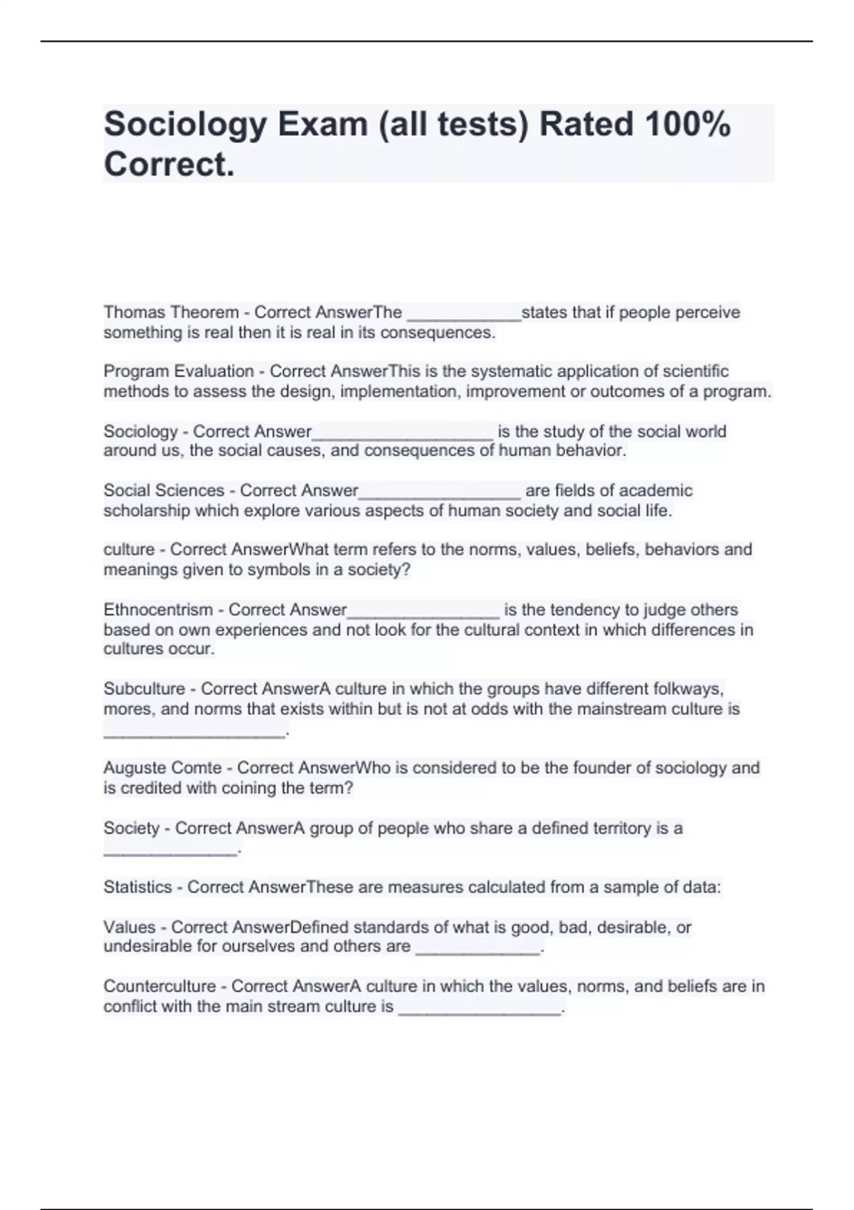 Sociology Exam (all tests) Rated 100% Correct.