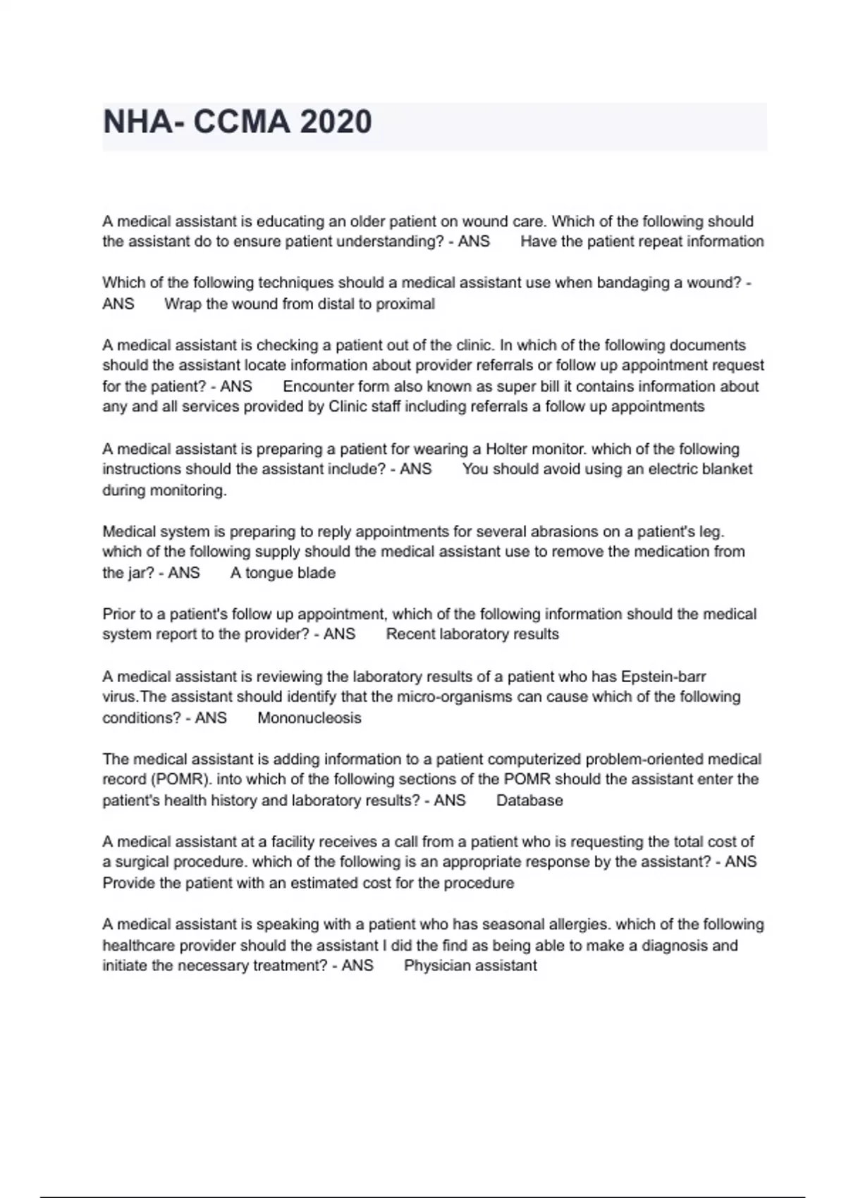 NHA- CCMA 2024 A medical assistant is educating an older patient on wound care. Which of the following should the assistant do to ensure patient understanding? - ANS Have the patient repeat information Which of the following techniques should a medical assistant use when bandaging a wound? - ANS Wrap the wound from distal to proximal A medical assistant is checking a patient out of the clinic. In which of the following documents should the assistant locate information about provider referrals or follow up appointment request for the patient? - ANS Encounter form also known as super bill it contains information about any and all services provided by Clinic staff including referrals a follow up appointments A medical assistant is preparing a patient for wearing a Holter monitor. which of the following instructions should the assistant include? - ANS You should avoid using an electric blanket during monitoring. Medical system is preparing to reply appointments for several abrasions on a patient's leg. which of the following supply should the medical assistant use to remove the medication from the jar? - ANS A tongue blade Prior to a patient's follow up appointment, which of the following information should the medical system report to the provider? - ANS Recent laboratory results A medical assistant is reviewing the laboratory results of a patient who has Epstein-barr virus.The assistant should identify that the micro-organisms can cause which of the following conditions? - ANS Mononucleosis The medical assistant is adding information to a patient computerized problem-oriented medical record (POMR). into which of the following sections of the POMR should the assistant enter the patient's health history and laboratory results? - ANS Database A medical assistant at a facility receives a call from a patient who is requesting the total cost of a surgical procedure. which of the following is an appropriate response by the assistant? - ANS Provide the patient with an estimated cost for the procedure A medical assistant is speaking with a patient who has seasonal allergies. which of the following healthcare provider should the assistant I did the find as being able to make a diagnosis and initiate the necessary treatment? - ANS Physician assistant A medical assistant is explaining a venipuncture procedure to a patient. which of the following statements should the assistant take? - ANS "I'll be collecting a blood sample from you today, there will be a small stick in your arm." A medical system it is to use the Snellen chart to test an adult patients visual acuity. The assistant should instruct the patient to stand which of the following distance away? - ANS 20 feet Which of the following types of written correspondence can be signed by medical assistant? - ANS Notification letter to a patient about surgery arrangements Which of the following is outside of medical assistant scope of practice? - ANS Order additional laboratory test to confirm the patient's condition The medical system is monitoring a patient during a stress test. the patient becomes increasingly short of breath and tachycardia abnormalities appear in his EKG rhythm. which of the following actions should the assistant take first? - ANS Discontinue the test A medical assistant is caring for a patient who has come in contact with concrete debris. upon inspection of the eye the assistant sees debris on the surface of the sclera which of the following actions should the assistant take? - ANS Irrigate that I starting at the inner canthus and following to the outer canthus. when preparing a patient for Holter monitoring, which of the following actions should the medical assistant take? - ANS Vigorously dry the patient skin prior to electrode placement A medical assistant is measuring the vital signs of an adult patient. the assistant should identify which of the following blood pressure readings as stage two hypertension? - ANS 150/95 mm Hg A medical system is talking with an older adult patient who sustained a foot fracture in the fall. she reports managing most tasks at home well but has difficulty navigating with her crutches and is currently homebound. to which of the following resources should the assistant refer the patient? - ANS Meals on wheels A patient arrives at a clinic with a bill for x-rays the required due to an injury at the patient's place of employment. The patient has private insurance and is eligible for Worker's Compensation. The system should recognize that which of the following part is responsible for the payment of this bill? - ANS Paid in full by workers compensation A medical assistant is reinforcing teaching with a patient about lifestyle modifications to help regulate his hypertension. Which of the following statements by the patient indicates an understanding of the teaching? - ANS "I only smoked half a pack a day, so I'll just cut it out completely" Which of the following groups of EKG leads are bipolar? - ANS Leads I, II, and III In which of the following positions should a medical assistant place a patient when obtaining rectal temperature? - ANS Sims' A medical assistant is preparing 1 g/kg of activated charcoal for a patient who weighs 176lbs. How many grams of charcoal should the assistant prepare? - ANS 79 g (176x0.45=79.2=79) A medical assistant is making a new sign in sheet for the patients who have appointments that day. Which of the following information should the sign in sheet included? - ANS Providers name A medical assistant is preparing a patient has psoriasis to be exam by the provider. When inspecting the patient skin lesions, the assistant should expect to observe which of the following characteristics? - ANS Silvery, scaly A medical assistant is reviewing the medical history of a patient who regularly comes into contact with coal and wood dust. The assistant should recognize that this patient is at an increased risk for developing which of the following disorders? - ANS Emphysema A medical a