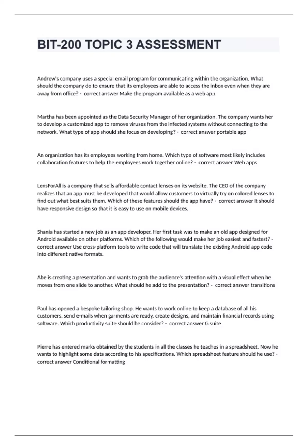 BIT-200 TOPIC 3 ASSESSMENTAndrew's company uses a special email program for communicating within the organization. What should the company do to ensure that its employees are able to access the inbox even when they are away from office? - correct answer Make the program available as a web app. Martha has been appointed as the Data Security Manager of her organization. The company wants her to develop a customized app to remove viruses from the infected systems without connecting to the network. What type of app should she focus on developing? - correct answer portable app An organization has its employees working from home. Which type of software most likely includes collaboration features to help the employees work together online? - correct answer Web apps LensForAll is a company that sells affordable contact lenses on its website. The CEO of the company realizes that an app must be developed that would allow customers to virtually try on colored lenses to find out what best suits them. Which of these features should the app have? - correct answer It should have responsive design so that it is easy to use on mobile devices. Shania has started a new job as an app developer. Her first task was to make an old app designed for Android available on other platforms. Which of the following would make her job easiest and fastest? - correct answer Use cross-platform tools to write code that will translate the existing Android app code into different native formats. Abe is creating a presentation and wants to grab the audience's attention with a visual effect when he moves from one slide to another. What should he add to the presentation? - correct answer transitions Paul has opened a bespoke tailoring shop. He wants to work online to keep a database of all his customers, send e-mails when garments are ready, create designs, and maintain financial records using software. Which productivity suite should he consider? - correct answer G suite Pierre has entered marks obtained by the students in all the classes he teaches in a spreadsheet. Now he wants to highlight some data according to his specifications. Which spreadsheet feature should he use? - correct answer Conditional formatting