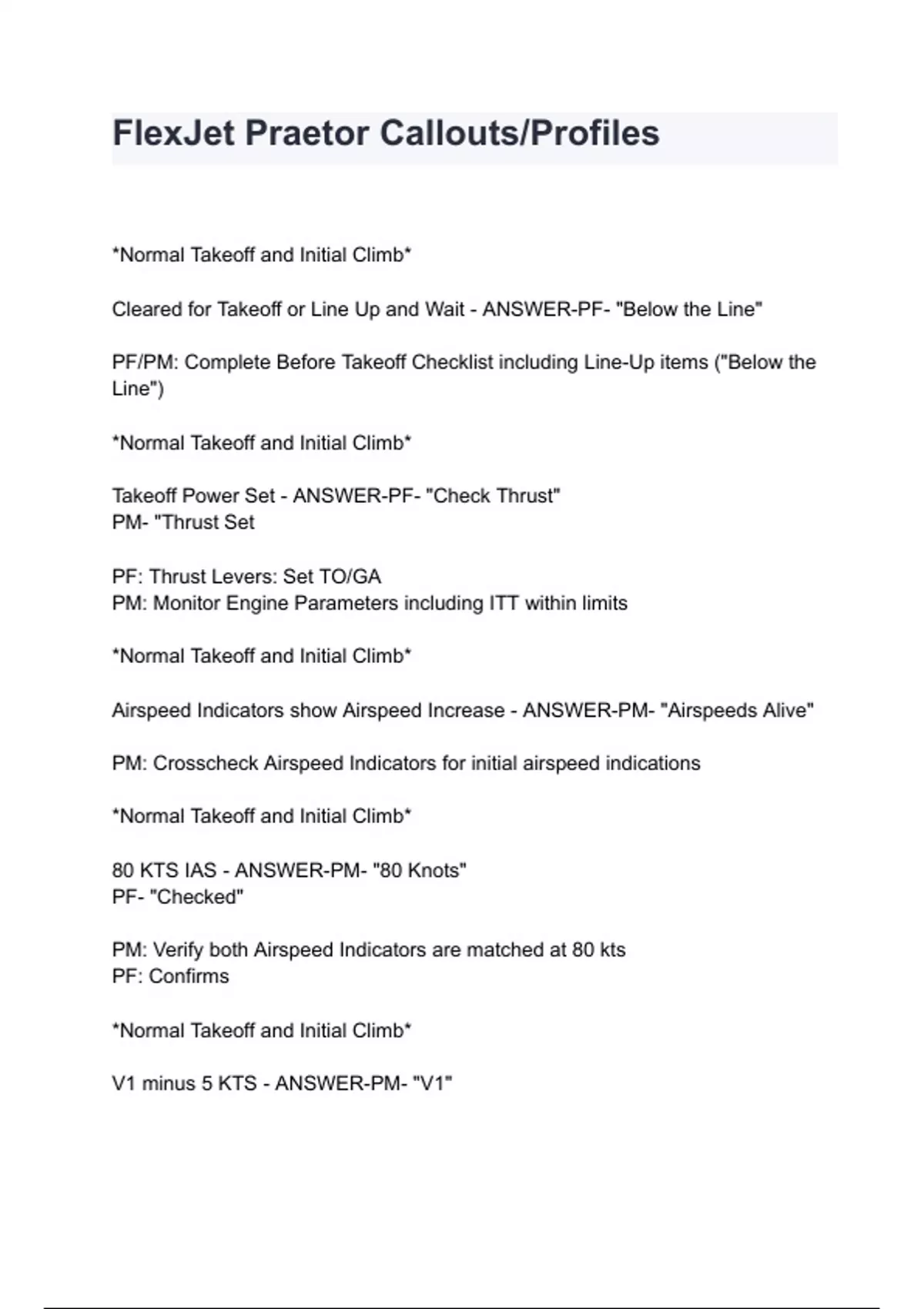 Normal Takeoff and Initial Climb* Cleared for Takeoff or Line Up and Wait - ANSWER-PF- "Below the Line" PF/PM: Complete Before Takeoff Checklist including Line-Up items ("Below the Line") *Normal Takeoff and Initial Climb* Takeoff Power Set - ANSWER-PF- "Check Thrust" PM- "Thrust Set PF: Thrust Levers: Set TO/GA PM: Monitor Engine Parameters including ITT within limits *Normal Takeoff and Initial Climb* Airspeed Indicators show Airspeed Increase - ANSWER-PM- "Airspeeds Alive" PM: Crosscheck Airspeed Indicators for initial airspeed indications *Normal Takeoff and Initial Climb* 80 KTS IAS - ANSWER-PM- "80 Knots" PF- "Checked" PM: Verify both Airspeed Indicators are matched at 80 kts PF: Confirms *Normal Take