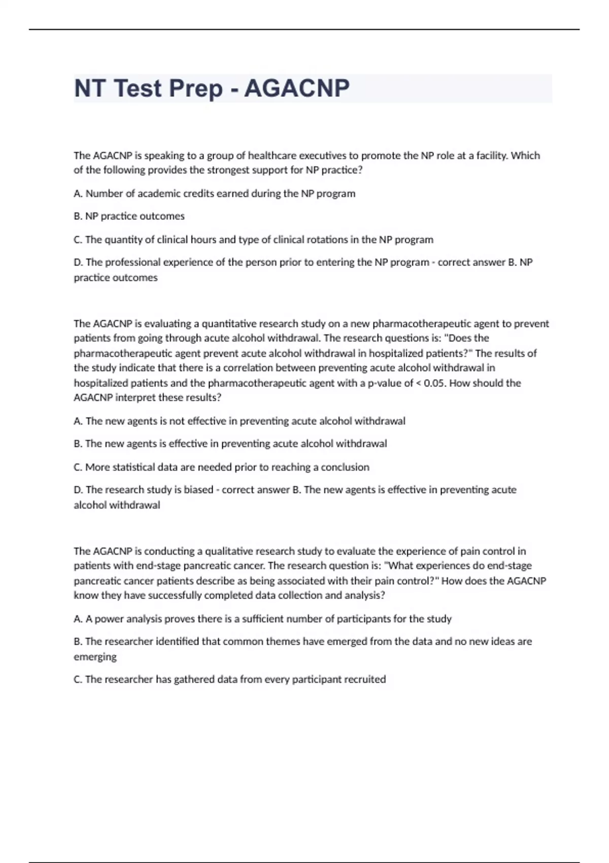 NT Test Prep - AGACNP Question and answers already passed 2024 The AGACNP is speaking to a group of healthcare executives to promote the NP role at a facility. Which of the following provides the strongest support for NP practice? A. Number of academic credits earned during the NP program B. NP practice outcomes C. The quantity of clinical hours and type of clinical rotations in the NP program D. The professional experience of the person prior to entering the NP program - correct answer B. NP practice outcomes The AGACNP is evaluating a quantitative research study on a new pharmacotherapeutic agent to prevent patients from going through acute alcohol withdrawal. The research questions is: "Does the pharmacotherapeutic agent prevent acute alcohol withdrawal in hospitalized patients?" The results of the study indicate that there is a correlation between preventing acute alcohol withdrawal in hospitalized patients and the pharmacotherapeutic agent with a p-value of < 0.05. How should the AGACNP interpret these results? A. The new agents is not effective in preventing acute alcohol withdrawal B. The new agents is effective in preventing acute alcohol withdrawal C. More statistical data are needed prior to reaching a conclusion D. The research study is biased - correct answer B. The new agents is effective in preventing acute alcohol withdrawal The AGACNP is conducting a qualitative research study to evaluate the experience of pain control in patients with end-stage pancreatic cancer. The research question is: "What experiences do end-stage pancreatic cancer patients describe as being associated with their pain control?" How does the AGACNP know they have successfully completed data collection and analysis? A. A power analysis proves there is a sufficient number of participants for the study B. The researcher identified that common themes have emerged from the data and no new ideas are emerging