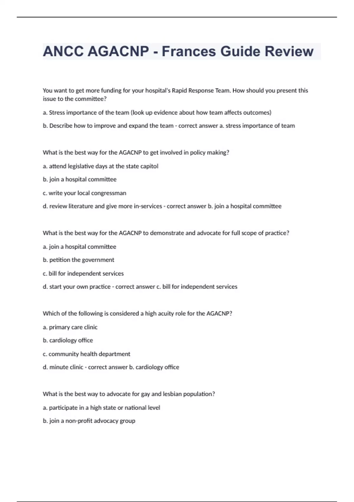ANCC AGACNP - Frances Guide Review Question and answers already passed 2024 You want to get more funding for your hospital's Rapid Response Team. How should you present this issue to the committee? a. Stress importance of the team (look up evidence about how team affects outcomes) b. Describe how to improve and expand the team - correct answer a. stress importance of team What is the best way for the AGACNP to get involved in policy making? a. attend legislative days at the state capitol b. join a hospital committee c. write your local congressman d. review literature and give more in-services - correct answer b. join a hospital committee What is the best way for the AGA