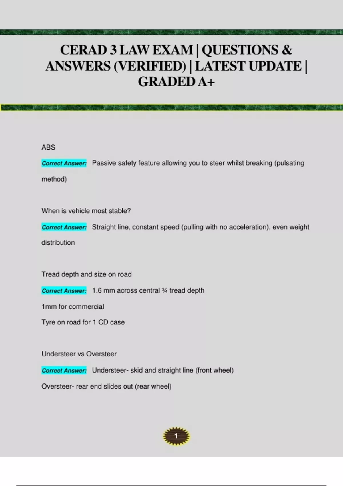 1 CERAD 3 LAW EXAM | QUESTIONS & ANSWERS (VERIFIED) | LATEST UPDATE | GRADED A+ ABS Correct Answer: Passive safety feature allowing you to steer whilst breaking (pulsating method) When is vehicle most stable? Correct Answer: Straight line, constant speed (pulling with no acceleration), even weight distribution Tread depth and size on road Correct Answer: 1.6 mm across central ¾ tread depth 1mm for commercial Tyre on road for 1 CD case Understeer vs Oversteer Correct Answer: Understeer- skid and straight line (front wheel) Oversteer- rear end slides out (rear wheel) 2 Pre Driving Checks Correct Answer: a) Ensure handbrake is on and gear level c) Adjust seat, mirrors and steering wheel d) adjust mirror; half grass half sky f) switch on ignition, note warning lights, clutch down left hand on steering wheel, start engine. static brake test, g) check position of controls and auxiliaries g) seat belts and doors h) 15mph brake test- alert passengers, ensure no swerve or funny noises Positioning Correct Answer: View, Stability, Safety C1 licence terms Correct Answer: Every 5 years renew medical declaration via DVLA Over 45- renew licence via medical every 5 years Grandfather rights- once 70 every 3 years Steps to combat fatigue Correct Answer: 1)Coffee 2 shots of caffeine 2)Fresh air 3) Energy drink 4)Brisk walk 3 5) 15 minute nap 6) Stop in a safe place 7)Seat position and PDC Fatigue Correct Answer: More likely to suffer over 45 yrs More tired between Points of licence Correct Answer: Dangerous driving- £200 fine and 6 points 12 points, min 6 months ban or longer Over 6 in ambulance service Phone use- 6 points and £1000 fine Responsibility of driver to keep up knowledge or the HWX Positive responces Correct Answer: 1)Moving left 2)looking in mirrors 3)slowing down 4)indicating left Safe cornering Correct Answer: 1)Correct position 4 2)Correct speed for corner identified 3)Correct gear selection throughout 4)Able to stop safely within distance you can see to be clear on your side of the road 5)Acceleration Vehicle condition Correct Answer: Keep vehicle and tyres in good condition and keep pressures to recommended level Cornering Forces Correct Answer: Steering, acceleration and braking The more you brake/accelerate, the less grip you have for steering The faster you travel into a bend, the less stability -skid Cambers Correct Answer: Crown= dome shaped road (left hand turn increases steering capability) Superelevation= width is banked up towards edge of bend Factors Affecting Cornering Correct Answer: Speed Specification of vehicle Steering 5 Acceleration Braking Road slope Road surface Weather Tyres Limit Point Correct Answer: furthest point to which you have an interrupted view of road surface Forces affecting stability and tyre grip Correct Answer: Steering, Acceleration, Braking SYSTEM Correct Answer: Information Position Speed Gear Acceleration Factors affecting overtaking Correct Answer: If you can see far enough Don't cause others to alter position 6 Ensure you can always move back Be ready to abandon is hazard occurs Avoid conflict Avoid overtaking three abreast Ensure vehicle is able to overtake Never use hardshoulder Overtaking Stationary Vehicles Correct Answer: Use system Judge speed of oncoming traffic Pedestrians Road side traffic Junctions on bends Overtaking Moving Vehicles Correct Answer: Situation changes all the time Consider speed/acceleration Capabilities of own vehicles Physical features, road layout Gear is responsive Don't accelerate too early Only overtake on left in slow moving traffic to keep up with speed 7 Steps to overtake Correct Answer: Do I need to? Is vehicle capable? Is it necessary for circumstances? Hazards Correct Answer: Junctions Cyclists Road layout/surface Bends Pedestrians Vehicles in front/behind Single/dual carriageway Position for Overtake Correct Answer: Following position - Overtake position - Overtaking (Behind) (Hold Out & Look) (Acceleration) Types of motorways Correct Answer: Standard Managed Dynamic Hard Shoulder (SMART) Managed All Lane Running (SMART) 8 What is a smart motorway? Correct Answer: Traffic management methods to reduce congestion and control speed regulations with variable speeds and hard shoulders Reversing and Manoeuvres Correct Answer: Slow speed Fast hands All round observations Mirror prioritisation Signs Correct Answer: Red Circle - give orders and prohibition Blue circle- positive instruction Triangular- warn drivers Octagon- STOP Upside down triangular- GIVE WAY School crossing and traffic crossing on BLUE LIGHTS Correct Answer: You have to stop Crossings Correct Answer: Puffin- sensers no amber phase Pelican- timer and amber phase 9 Toucan- pedestrians and cyclists, sneer and no amber phase Stress Strategies Correct Answer: Adjust seat and steering wheel so not tense Calm professional approach Dont dwell on previous stresses or errors Noble Cause Correct Answer: Do not sacrifice safety for speed Never justify risks by thinking risk is for noble cause STOP when tempted to take risks Red Mist Correct Answer: Your attention is not on your driving but on some specific goal; emotionally and physiologically caught up in the incident Driving license Correct Answer: Individuals responsibility to ensure licence is valid and in date inc name address etc. Photo card licence valid for 10 years Confrontational Behaviour Correct Answer: Task focused coping and reappraisal coping strategies are positive 10 Proceed safely through without any further reactions VDI Correct Answer: Exterior examination - battenburg clean and undamaged Wheels and tyres - correct vehicle tread depth and inflated to spec, cuts, bulges Under bonnet- brake and washer legal, also check engine oil and coolant Lights and reflectors - blue lights, head lights, reverse, brake, interior, fog, full beam Wipers and washers- clean and demisters Audible warning and exhaust- horn, sirens, Equipment- medicine etc fire extinguisher Section 19 Correct Answer: determines 