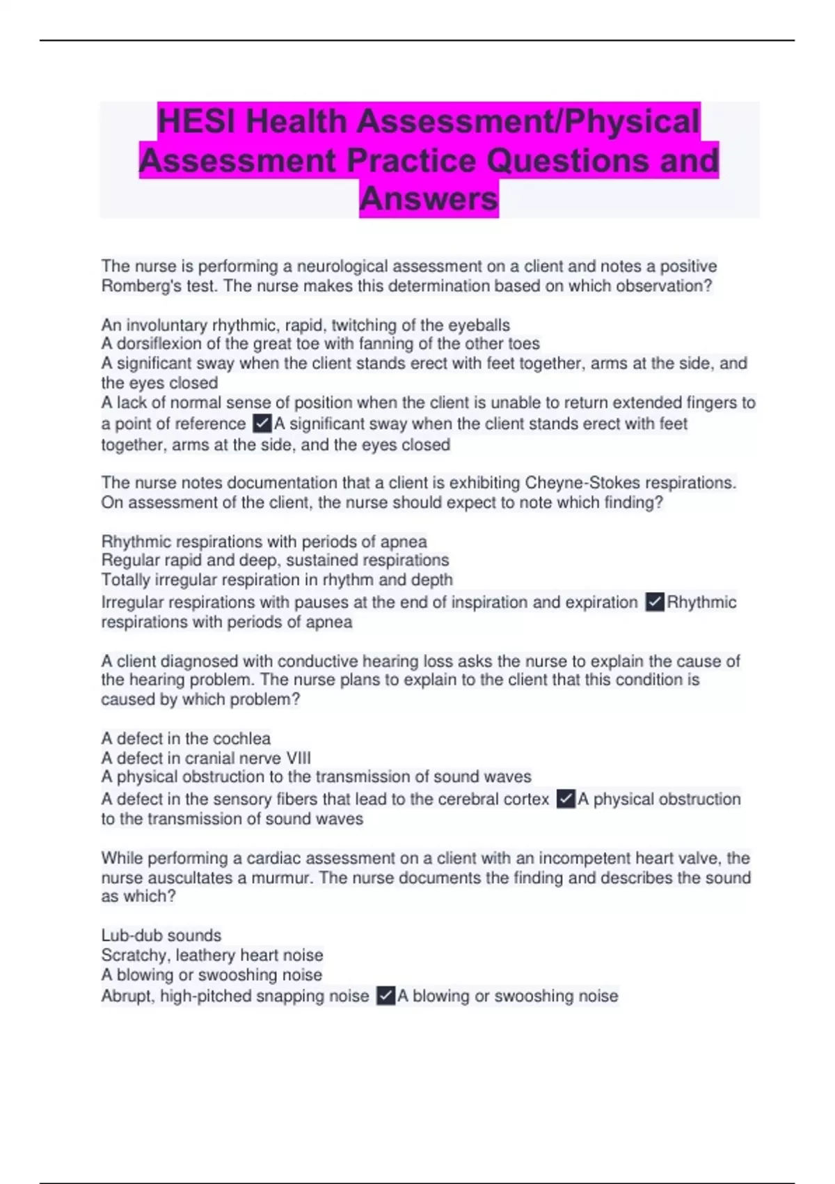 HESI Health Assessment/Physical Assessment Practice Questions and Answers