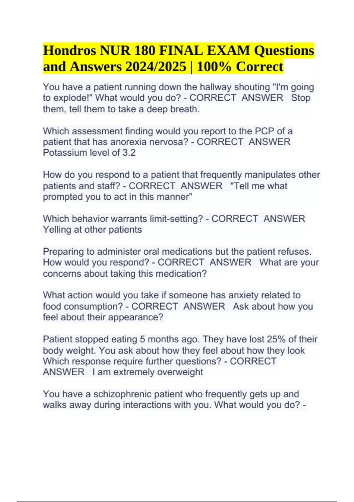 Hondros NUR 180 FINAL EXAM Questions and Answers 2024/2025 (100% Correct) You have a patient running down the hallway shouting "I'm going to explode!" What would you do? - CORRECT ANSWER Stop them, tell them to take a deep breath. Which assessment finding would you report to the PCP of a patient that has anorexia nervosa? - CORRECT ANSWER Potassium level of 3.2 How do you respond to a patient that frequently manipulates other patients and staff? - CORRECT ANSWER "Tell me what prompted you to act in this manner" Which behavior warrants limit-setting? - CORRECT ANSWER Yelling at other patients Preparing to administer oral medications but the patient refuses. How would you respond? - CORRECT ANSWER What are your concerns about taking this medication? What action would you take if someone has anxiety related to food consumption? - CORRECT ANSWER Ask about how you feel about their appearance? Patient stopped eating 5 months ago. They have lost 25% of their body weight. You ask about how they feel about how they look Which response require further questions? - CORRECT ANSWER I am extremely overweight You have a schizophrenic patient who frequently gets up and walks away during interactions with you. What would you do? - Hondros NUR 180 FINAL EXAM Questions and Answers 2024/2025 | 100% Correct CORRECT ANSWER You sit at eye level across the table from them, You have a patient who is looking nervously and frequently at the door. How do you respond to this patient? - CORRECT ANSWER "I noticed you keep looking at the door" You have a severely depressed patient being discharged. What action would you take? - CORRECT ANSWER Develop a goal directive problem-centered relationship. Patient states "I feel close to you, you are the only true friend I have" How would you respond? - CORRECT ANSWER "Our relationship is professional, but let's explore ways to strengthen friendships" Judaism. Patient is dying and requests spiritual beliefs to be followed. What action would you take? - CORRECT ANSWER Offer the family assistance with any religious traditions. A woman who has been in an abusive relationship over the last 7 years arrives at the crisis center with her 2 children crying. What do you do? - CORRECT ANSWER Direct her to the nearest woman's domestic abuse center You are working with a male client to instill a feeling of selfcommitment to improve his self-esteem. What would you do? - CORRECT ANSWER Have the client promise himself that he will do the best he can, knowing that failure is a possibility You have a patient that is a roman catholic and you are gathering information for spiritual assessment. What action would you take? - CORRECT ANSWER Assess the patient for any spiritual beliefs and document information Which patient would indicate spiritual distress? - CORRECT ANSWER Patient hesitating to talk to their church's pastor What would you do in regards to spiritual care? - CORRECT ANSWER Help patient's maintain self-awareness and inner strength. What statement by the nurse is an example of therapeutic communication? - CORRECT ANSWER "I think you need to know more about how your medications work." You have a patient undergoing electroconvulsive therapy in the morning. What do you need to do prior? - CORRECT ANSWER Allow the patient to sign the informed consent after the Dr. explains the procedure The patient is having difficulty remembering the information taught by the nurse. What would you do? - CORRECT ANSWER Give simple, clear instructions and repeat if necessary. Which statement is true regarding coping skills? - CORRECT ANSWER Limited financial resources can be a risk for coping difficulties You have a patient admitting themselves to a psyche unit and a few days later they request to go home for a "Quinceanera" What would you say? - CORRECT ANSWER You would tell the patient she can leave and she will have the physician write the order right away. When reviewing data, which is the priority concern? - CORRECT ANSWER Patient expressing feelings of doom and hopelessness. You have a patient having difficulty communicating their medical history. What would you do? - CORRECT ANSWER Offer the patient a pen and paper which could help them communicate You are caring for a patient who has alzheimer's having difficulty in time orientation. What will you do to assist the patient to reorient them? - CORRECT ANSWER Create a calendar full of activities, times, dates, and events. You have a patient receiving palliative care. What can you teach the patient? - CORRECT ANSWER The goal of palliative care is to relieve symptoms, life-threatening side effects, and diseases. To prevent liability related to controlled substance (in regards to morphine). What actions by the nurse would need further teaching? - CORRECT ANSWER Morphine is NOT a controlled substance and will not be found in locked boxes.