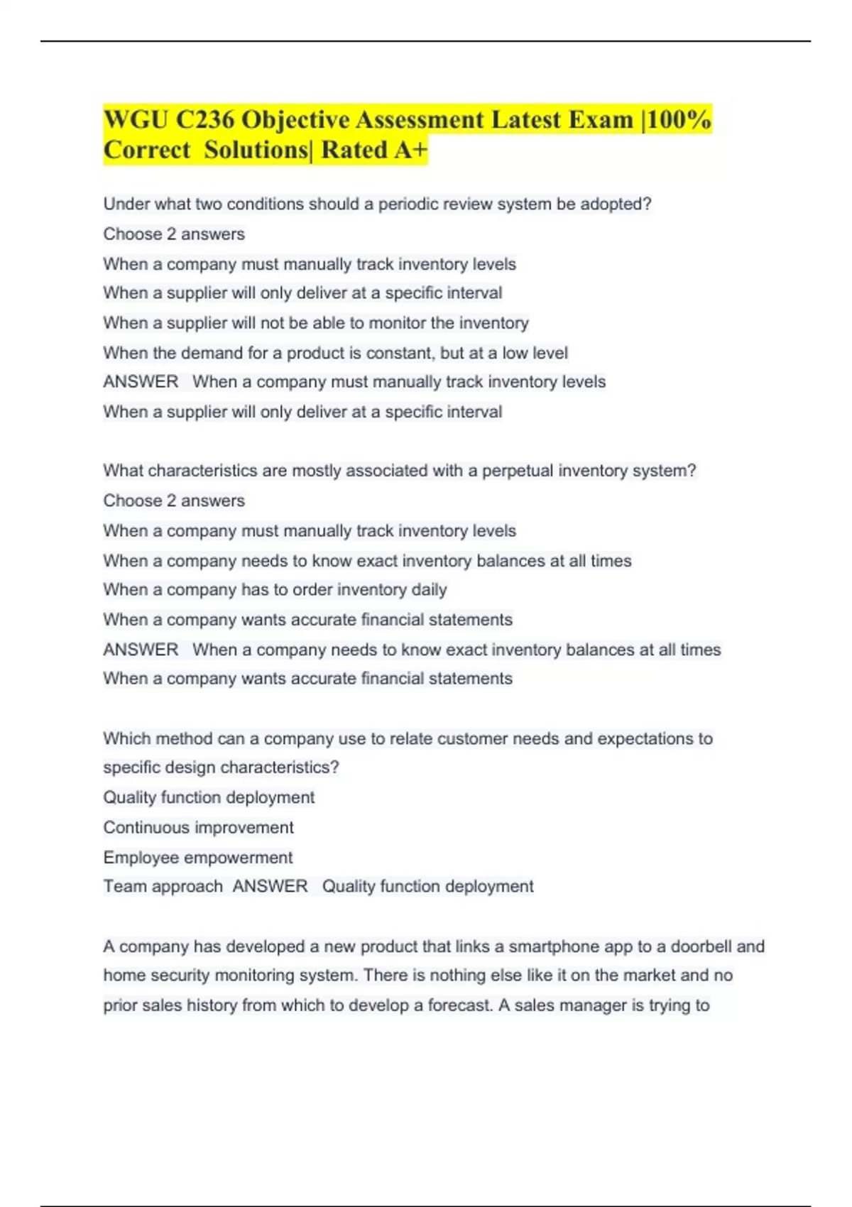 WGU C236 Objective Assessment Latest Exam |100% Correct Solutions| Rated A+ Under what two conditions should a periodic review system be adopted? Choose 2 answers When a company must manually track inventory levels When a supplier will only deliver at a specific interval When a supplier will not be able to monitor the inventory When the demand for a product is constant, but at a low level ANSWER When a company must manually track inventory levels When a supplier will only deliver at a specific interval What characteristics are mostly associated with a perpetual inventory system? Choose 2 answers When a company must manually track inventory levels When a company needs to know exact inventory balances at all times When a company has to order inventory daily When a company wants accurate financial statements ANSWER When a company needs to know exact inventory balances at all times When a company wants accurate financial statements Which method can a company use to relate customer needs and expectations to specific design characteristics? Quality function deployment Continuous improvement Employee empowerment Team approach ANSWER Quality function deployment A company has developed a new product that links a smartphone app to a doorbell and home security monitoring system. There is nothing else like it on the market and no prior sales history from which to develop a forecast. A sales manager is trying to determine the best price point for introduction, while also trying to estimate what first-year sales volumes might be. What are two possible means for determining the price point and first-year sales forecast? Choose 2 answers Exponential smoothing Panel of experts Test market Buildup method ANSWER Panel of experts Test market