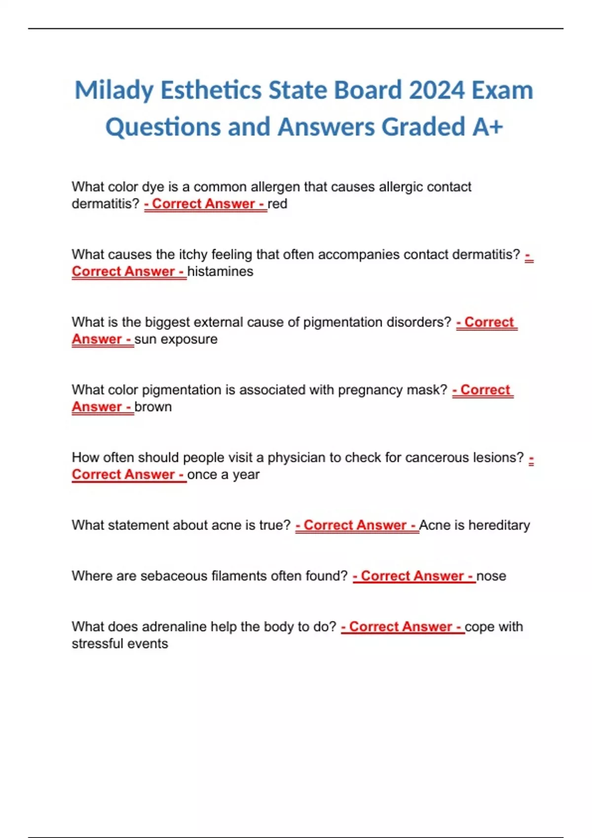 Milady Esthetics State Board 2024 Exam Questions and Answers Graded A+ Milady Esthetics State Board 2024 Exam Questions and Answers Graded A+ Milady Esthetics State Board 2024 Exam Questions and Answers Graded A+