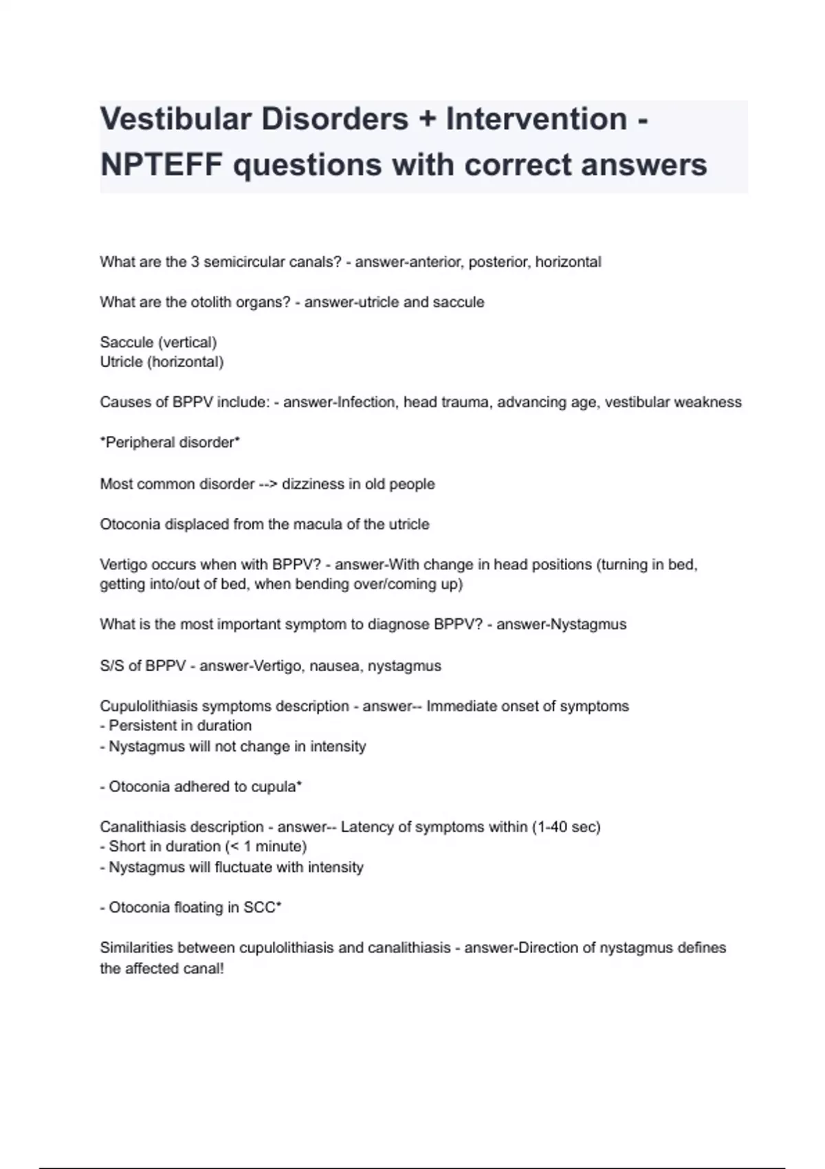Vestibular Disorders + Intervention - NPTEFF questions with correct answers What are the 3 semicircular canals? - answer-anterior, posterior, horizontal What are the otolith organs? - answer-utricle and saccule Saccule (vertical) Utricle (horizontal) Causes of BPPV include: - answer-Infection, head trauma, advancing age, vestibular weakness *Peripheral disorder* Most common disorder --> dizziness in old people Otoconia displaced from the macula of the utricle Vertigo occurs when with BPPV? - answer-With change in head positions (turning in bed, getting into/out of bed, when bending over/coming up) What is the most important symptom to diagnose BPPV? - answer-Nystagmus S/S of BPPV - answer-Vertigo, nausea, nystagmus Cupuloli