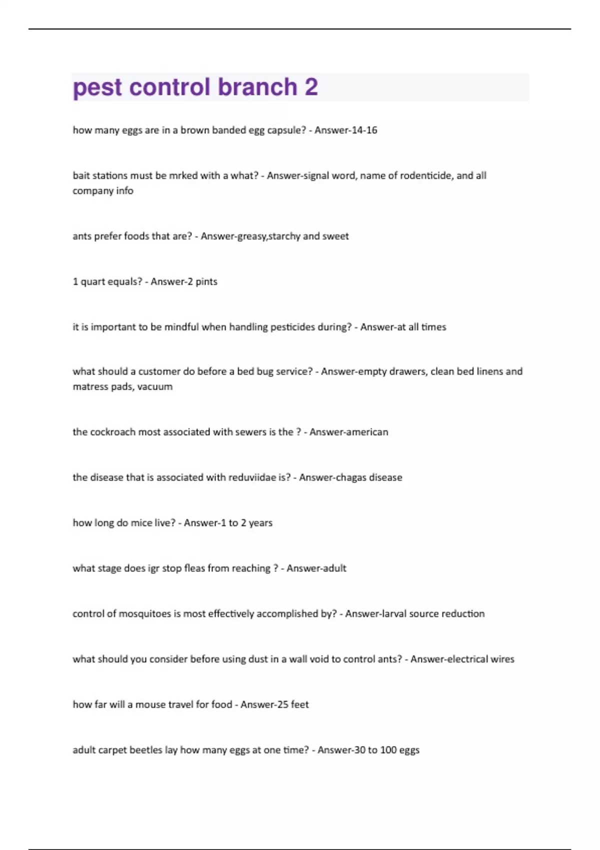 how many eggs are in a brown banded egg capsule? - Answer-14-16 bait stations must be mrked with a what? - Answer-signal word, name of rodenticide, and all company info ants prefer foods that are? - Answer-greasy,starchy and sweet 1 quart equals? - Answer-2 pints it is important to be mindful when handling pesticides during? - Answer-at all times what should a customer do before a bed bug service? - Answer-empty drawers, clean bed linens and matress pads, vacuum the cockroach most associated with sewers is the ? - Answer-american the disease that is associated with reduviidae is? - Answer-chagas disease how long do mice live? - Answer-1 to 2 years what stage does igr stop fleas from reaching ? - Answer-adult control of mosquitoes is most effectively accomplished by? - Answer-larval source reduction what should you consider before using dust in a wall void to control ants? - Answer-electrical wires how far will a mouse travel for food - Answer-25 feet adult carpet beetles lay how many eggs at one time? - Answer-30 to 100 eggswhat amount of space does a rat need to enter a structure? - Answer-half of an inch what is the smallest domestic roach? - Answer-brown banded what is the size of an adult american cockroach? - Answer-1 3/8 to 2 1/8 inch how long does it take for a bed bug to finish a meal? - Answer-3 to 10 mins which cockroach prefers warm, wet locations? - Answer-american how many rats are in a typical litter? - Answer-4 to 8 in one litter what is the most diffcult stages of fleas to treat? - Answer-pupa