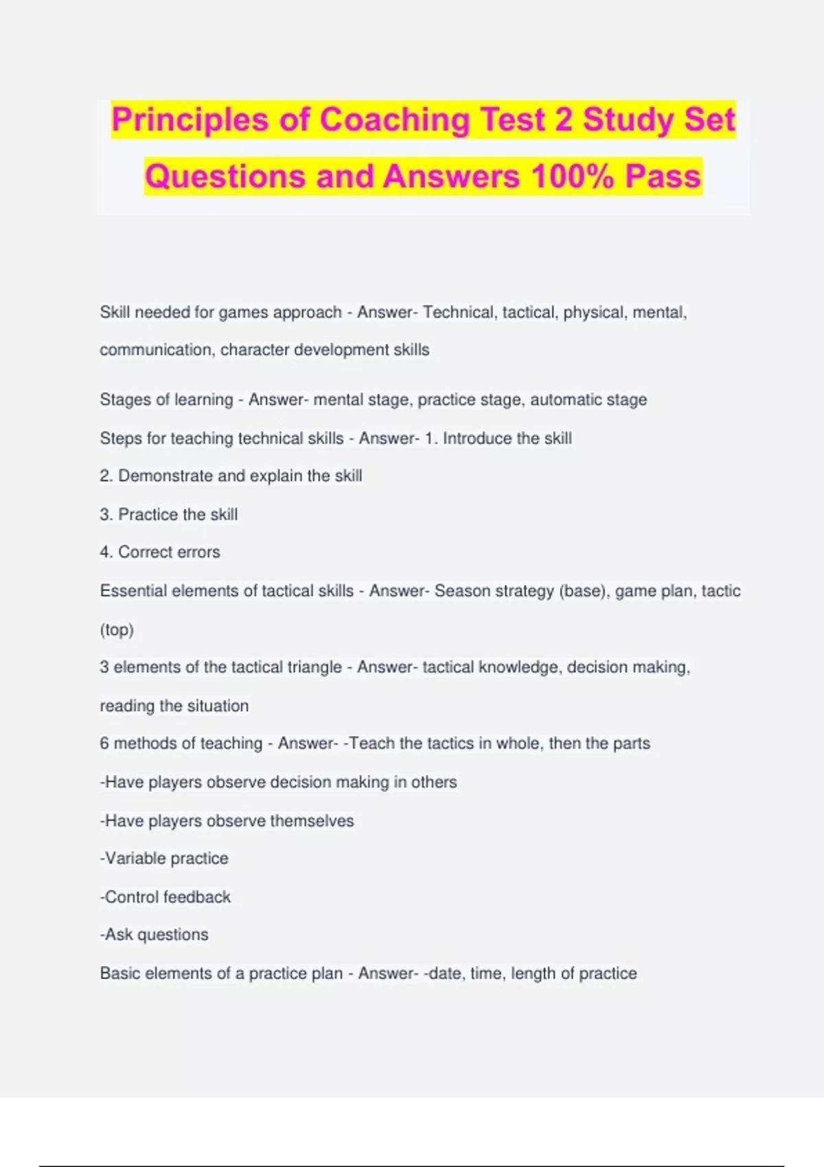 Principles of Coaching Test 2 Study Set Questions and Answers 100% Pass Skill needed for games approach - Answer- Technical, tactical, physical, mental, communication, character development skills Stages of learning - Answer- mental stage, practice stage, automatic stage Steps for teaching technical skills - Answer- 1. Introduce the skill 2. Demonstrate and explain the skill 3. Practice the skill 4. Correct errors Essential elements of tactical skills - Answer- Season strategy (base), game plan, tactic (top) 3 elements of the tactical triangle - Answer- tactical knowledge, decision making, reading the situation 6 methods of teaching - Answer- -Teach the tactics in whole, then the parts -Have players observe decision making in others -Have players observe themselves -Variable practice -Control feedback -Ask questions Basic elements of a practice plan - Answer- -date, time, length of practice