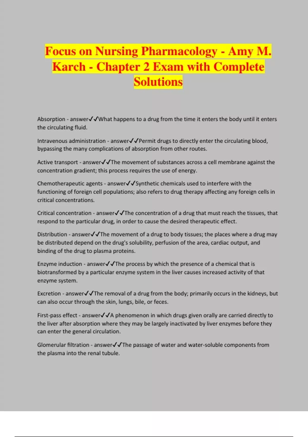 Focus on Nursing Pharmacology - Amy M. Karch - Chapter 2 Exam with Complete Solutions Absorption - answerWhat happens to a drug from the time it enters the body until it enters the circulating fluid. Intravenous administration - answerPermit drugs to directly enter the circulating blood, bypassing the many complications of absorption from other routes. Active transport - answerThe movement of substances across a cell membrane against the concentration gradient; this process requires the use of energy. Chemotherapeutic agents - answerSynthetic chemicals used to interfere with the functioning of foreign cell populations; also refers to drug therapy affecting any foreign cells in critical concentrations. Critical concentration - answerThe concentration of a drug that must reach the tissues, that respond to the particular drug, in order to cause the desired therapeutic effect. Distribution - answerThe movement of a drug to body tissues; the places where a drug may be distributed depend on the drug's solubility, perfusion of the area, cardiac output, and binding of the drug to plasma proteins. Enzyme induction - answerThe process by which the presence of a chemical that is biotransformed by a particular enzyme system in the liver causes increased activity of that enzyme system. Excretion - answerThe removal of a drug from the body; primarily occurs in the kidneys, but can also occur through the skin, lungs, bile, or feces. First-pass effect - answerA phenomenon in which drugs given orally are carried directly to the liver after absorption where they may be largely inactivated by liver enzymes before they can enter the general circulation. Glomerular filtration - answerThe passage of water and water-soluble components from the plasma into the renal tubule.