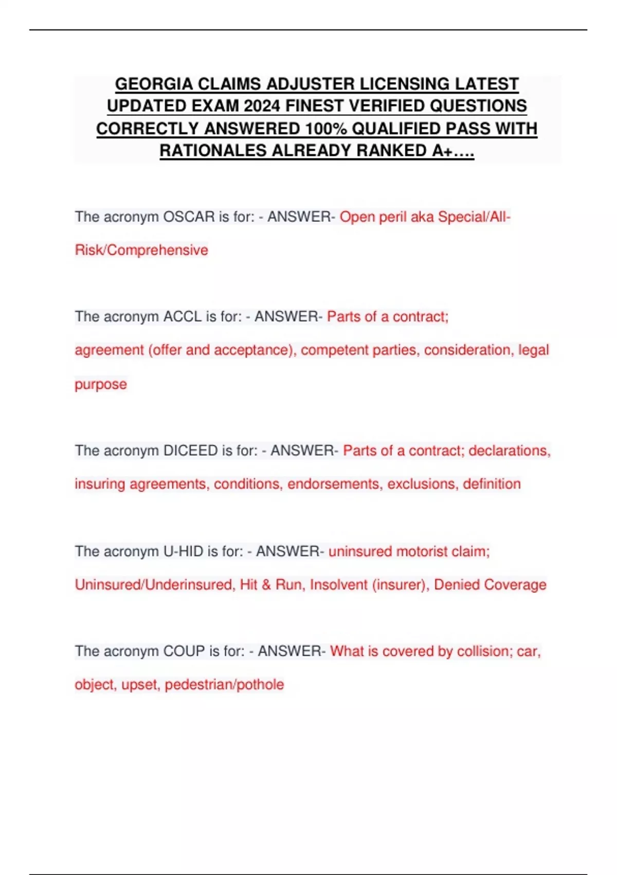 GEORGIA CLAIMS ADJUSTER LICENSING LATEST UPDATED EXAM 2024 FINEST VERIFIED QUESTIONS CORRECTLY ANSWERED 100% QUALIFIED PASS WITH RATIONALES ALREADY RANKED A+…. The acronym OSCAR is for: - ANSWER- Open peril aka Special/AllRisk/Comprehensive The acronym ACCL is for: - ANSWER- Parts of a contract; agreement (offer and acceptance), competent parties, consideration, legal purpose The acronym DICEED is for: - ANSWER- Parts of a contract; declarations, insuring agreements, conditions, endorsements, exclusions, definition The acronym U-HID is for: - ANSWER- uninsured motorist claim; Uninsured/Underinsured, Hit & Run, Insolvent (insurer), Denied Coverage The acronym COUP is for: - ANSWER- What is covered by collision; car, object, upset, pedestrian/pothole The acronym DDPB (Don't Drink Peanut Butter) is for: - ANSWERNegligent Liability; Duty to Act, Breach of Duty, Damages, Proximate Cause The acronym WWNI is for: - ANSWER- "We will never insure" or standard exclusions; wear and tear, war, nuclear, intentional loss The acronym AMStAR is for: - ANSWER- methods of valuation; agreed value, market value, Stated value, Replacement Cost, Actual Cash Value The acronym WC-SHAVER is for: - ANSWER- Extended coverage; windstorm, civil commotion, smoke, hail, aircraft, vehicle, explosion, riot The acronym WSH is for: - ANSWER- exclusions for tree/shrub/plant coverage; wind, hail, smoke The acronym FLI is for: - ANSWER- DP1 perils; fire, lightning, internal explosions The acronym is APE for: - ANSWER- Personal inland marine insurance floaters; articles, property, effects The acronym SWIMSWAM is for: - ANSWER- yacht definition; sailboat with auxiliary inboard motor The acronym SIR is for: - ANSWER- "Deductible" on an umbrella policy; self-insured retention The acronym DRTCC is for: - ANSWER- Types of unfair trade practices; rebate, coercion, twisting, defamation, commingling The acronym DOPLA is for: - ANSWER- DP coverages; Dwelling, Other Structures, Personal Property, Loss of Fair Rental Value, Additional Living Expenses The acronym OSCAR is for: - ANSWER- Open peril aka Special/AllRisk/Comprehensive The acronym ACCL is for: - ANSWER- Parts of a contract; agreement (offer and acceptance), competent parties, consideration, legal purpose The acronym DICEED is for: - ANSWER- Parts of a contract; declarations, insuring agreements, conditions, endorsements, exclusions, definition The acronym U-HID is for: - ANSWER- uninsured motorist claim; Uninsured/Underinsured, Hit & Run, Insolvent (insurer), Denied Coverage The acronym COUP is for: - ANSWER- What is covered by collision; car, object, upset, pedestrian/pothole The acronym DDPB (Don't Drink Peanut Butter) is for: - ANSWERNegligent Liability; Duty to Act, Breach of Duty, Damages, Proximate Cause The acronym WWNI is for: - ANSWER- "We will never insure" or standard exclusions; wear and tear, war, nuclear, intentional loss The acronym AMStAR is for: - ANSWER- methods of valuation; agreed value, market value, Stated value, Replacement Cost, Actual Cash Value The acronym WC-SHAVER is for: - ANSWER- Extended coverage; windstorm, civil commotion, smoke, hail, aircraft, vehicle, explosion, riot The acronym WSH is for: - ANSWER- exclusions for tree/shrub/plant coverage; wind, hail, smoke The acronym FLI is for: - ANSWER- DP1 perils; fire, lightning, internal explosions The acronym is APE for: - ANSWER- Personal inland marine insurance floaters; articles, property, effects The acronym SWIMSWAM is for: - ANSWER- yacht definition; sailboat with auxiliary inboard motor The acronym SIR is for: - ANSWER- "Deductible" on an umbrella policy; self-insured retention The acronym DRTCC is for: - ANSWER- Types of unfair trade practices; rebate, coercion, twisting, defamation, commingling The acronym DOPLA is for: - ANSWER- DP coverages; Dwelling, Other Structures, Personal Property, Loss of Fair Rental Value, Additional Living Expenses