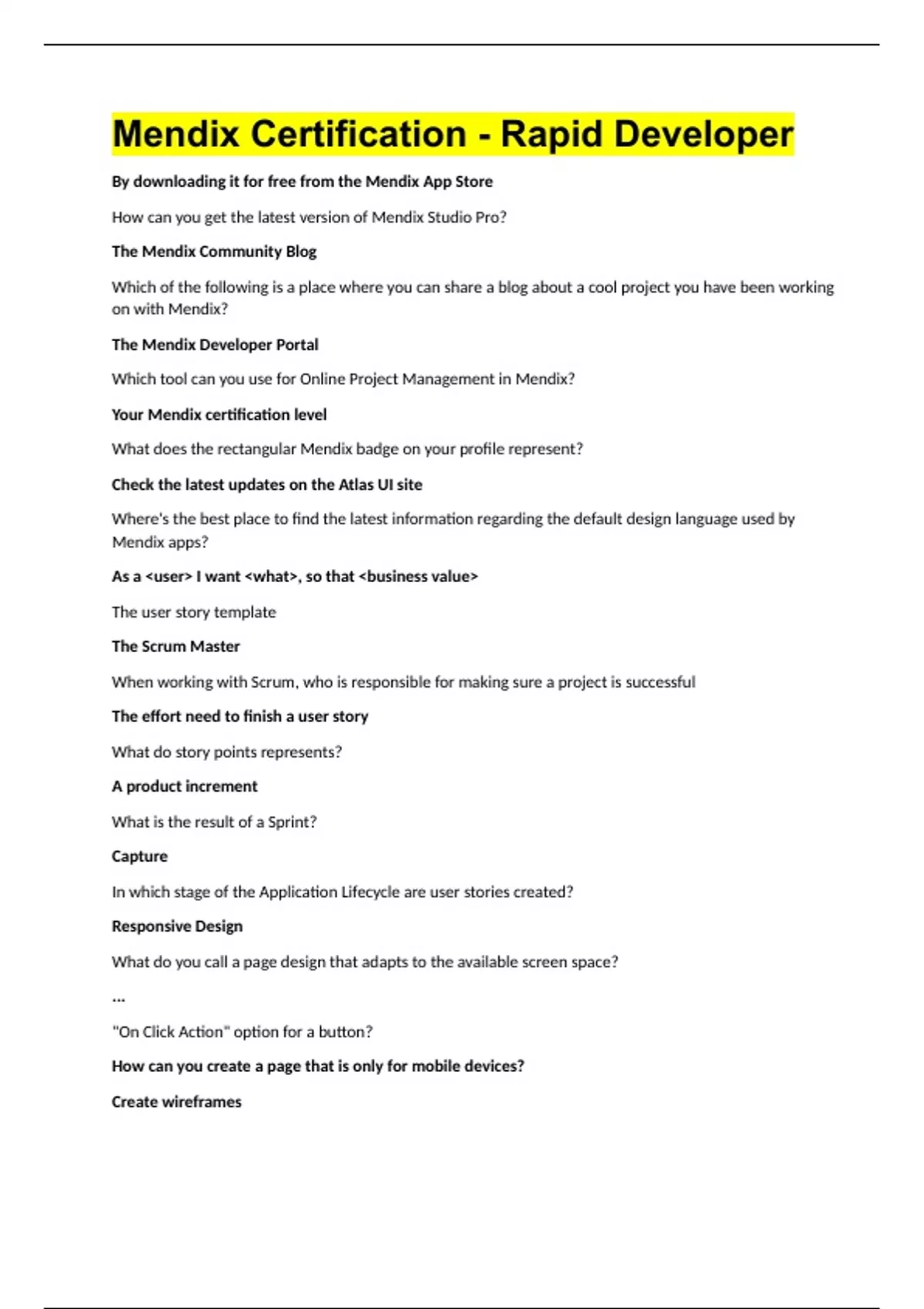 Mendix Certification - Rapid Developer By downloading it for free from the Mendix App Store How can you get the latest version of Mendix Studio Pro? The Mendix Community Blog Which of the following is a place where you can share a blog about a cool project you have been working on with Mendix? The Mendix Developer Portal Which tool can you use for Online Project Management in Mendix? Your Mendix certification level What does the rectangular Mendix badge on your profile represent? Check the latest updates on the Atlas UI site Where's the best place to find the latest information regarding the default design language used by Mendix apps? As a user I want what, so that business value The user story template The Scrum Master When working with Scrum, who is responsible for making sure a project is successful The effort need to finish a user story What do story points represents? A product increment What is the result of a Sprint? Capture In which stage of the Application Lifecycle are user stories created? Responsive Design What do you call a page design that adapts to the available screen space? ... "On Click Action" option for a button? How can you create a page that is only for mobile devices? Create wireframes