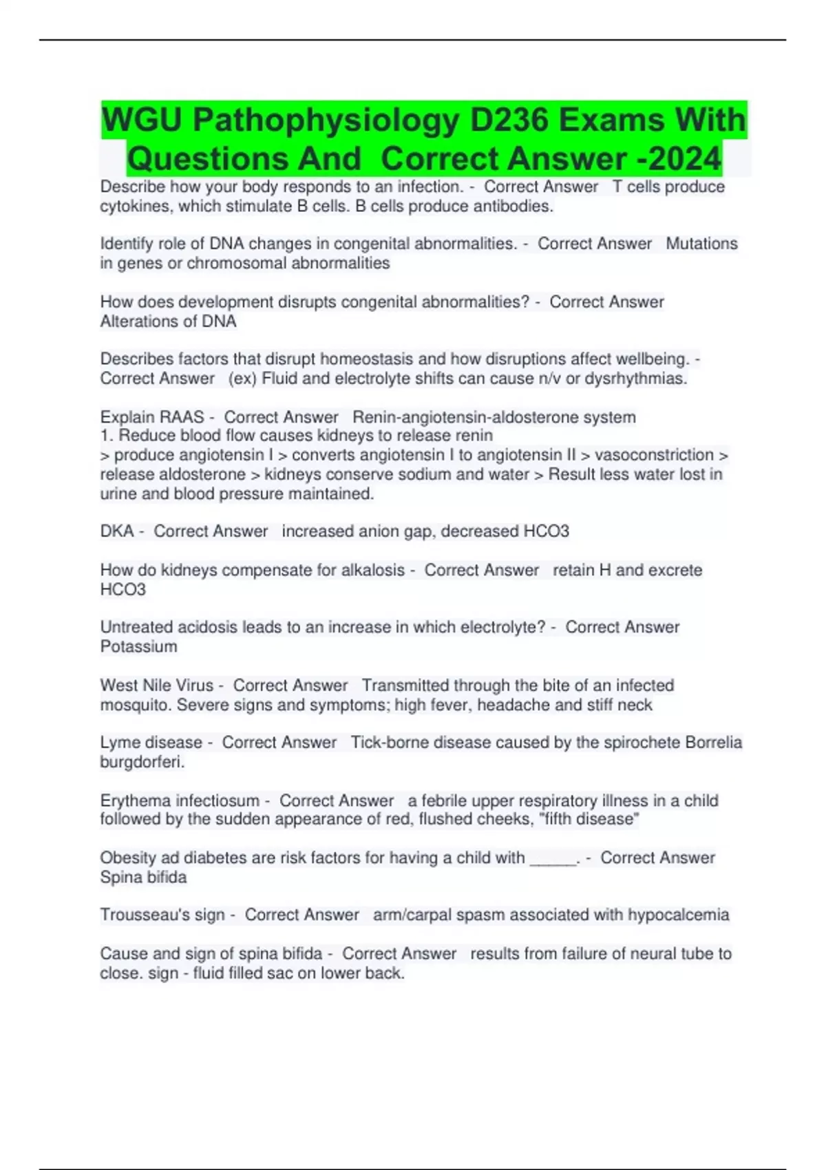Describe how your body responds to an infection. - Correct Answer T cells produce cytokines, which stimulate B cells. B cells produce antibodies. Identify role of DNA changes in congenital abnormalities. - Correct Answer Mutations in genes or chromosomal abnormalities How does development disrupts congenital abnormalities? - Correct Answer Alterations of DNA Describes factors that disrupt homeostasis and how disruptions affect wellbeing. - Correct Answer (ex) Fluid and electrolyte shifts can cause n/v or dysrhythmias. Explain RAAS - Correct Answer Renin-angiotensin-aldosterone system 1. Reduce blood flow causes kidneys to release renin > produce angiotensin I > converts angiotensin I to angiotensin II > vasoconstriction > release aldosterone > kidneys conserve sodium and water > Result less water lost in urine and blood pressure maintained. DKA - Correct Answer increased anion gap, decreased HCO3 How do kidneys compensate for alkalosis - Correct Answer retain H and excrete HCO3 Untreated acidosis leads to an increase in which electrolyte? - Correct Answer Potassium West Nile Virus - Correct Answer Transmitted through the bite of an infected mosquito. Severe signs and symptoms; high fever, headache and stiff neck Lyme disease - Correct Answer Tick-borne disease caused by the spirochete Borrelia burgdorferi. Erythema infectiosum - Correct Answer a febrile upper respiratory illness in a child followed by the sudden appearance of red, flushed cheeks, "fifth disease" Obesity ad diabetes are risk factors for having a child with _____. - Correct Answer Spina bifida