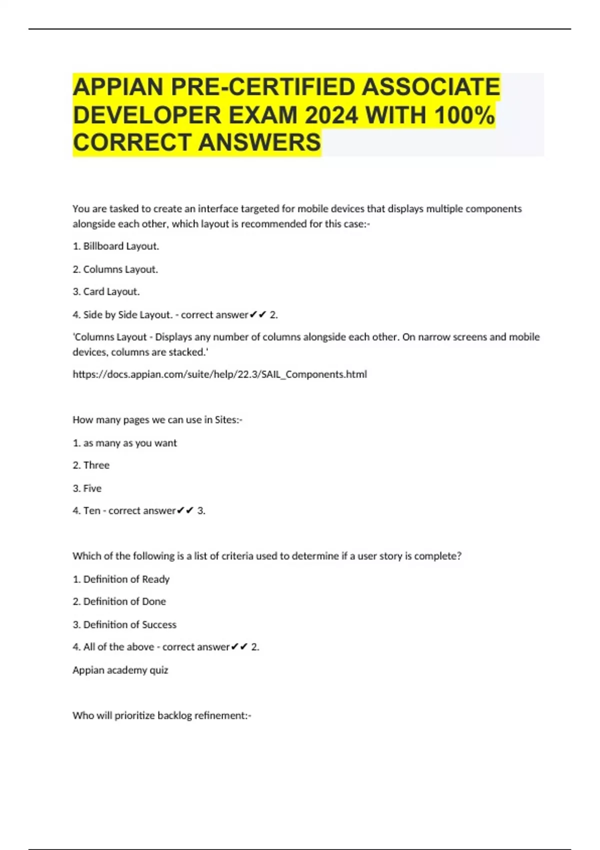 You are tasked to create an interface targeted for mobile devices that displays multiple components alongside each other, which layout is recommended for this case:- 1. Billboard Layout. 2. Columns Layout. 3. Card Layout. 4. Side by Side Layout. - correct answer 2. 'Columns Layout - Displays any number of columns alongside each other. On narrow screens and mobile devices, columns are stacked.' How many pages we can use in Sites:- 1. as many as you want 2. Three 3. Five 4. Ten - correct answer 3. Which of the following is a list of criteria used to determine if a user story is complete? 1. Definition of Ready 2. Definition of Done 3. Definition of Success 4. All of the above - correct answer 2. Appian academy quiz