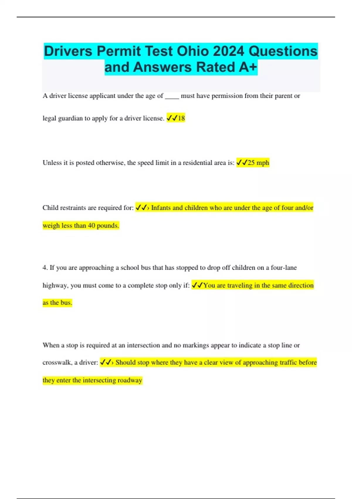 Drivers Permit Test Ohio 2024 Questions and Answers Rated A+ A driver license applicant under the age of ____ must have permission from their parent or legal guardian to apply for a driver license. 18 Unless it is posted otherwise, the speed limit in a residential area is: 25 mph Child restraints are required for: › Infants and children who are under the age of four and/or weigh less than 40 pounds. 4. If you are approaching a school bus that has stopped to drop off children on a four-lane highway, you must come to a complete stop only if: You are traveling in the same direction as the bus. When a stop is required at an intersection and no markings appear to indicate a stop line or crosswalk, a driver: › Should stop where they have a clear view of approaching traffic before they enter the intersecting roadway 6. A motorist must maintain a "safety zone" of at least ____ between their car and a motorcyclist. › Three seconds When passing an emergency vehicle stopped on the side of the road, drivers should: Vacate the lane closest to the emergency vehicle or slow down. 8. You may turn right on red: After coming to a complete stop and yielding to pedestrians and vehicles in the intersection. 9. You should signal to turn ____ before beginning your turn. 100 feet 10. During normal weather and traffic conditions, keep a minimum following distance of: 3 seconds 11. In bad weather, increase your following distance to: 4 to 5 seconds 12. The speed limit in school zones is: 20 mph 13. Unless otherwise posted, the speed limit on freeways with paved shoulders is: 65 MPH 14. When parallel parking, you should park within ____ inches of the curb 12 inches 15. Texting while driving is: Illegal 16 driving while holding your pet is Illegal 17. When driving in snowy or icy conditions, you should Decrease your speed 18. In general, when driving, you should drive: On the right half of the road 19. You may not pass other vehicles within ____ of a bridge, viaduct, or tunnel. 100 feet 20. A license will be suspended if a driver: Refuses to submit to a chemical test 21. A driver under the age of 21 can be charged with Operating a Vehicle After Underage Consumption if they drive with a minimum blood alcohol content (BAC) of: 0.02 percent 22. It is illegal for a person 21 years of age or