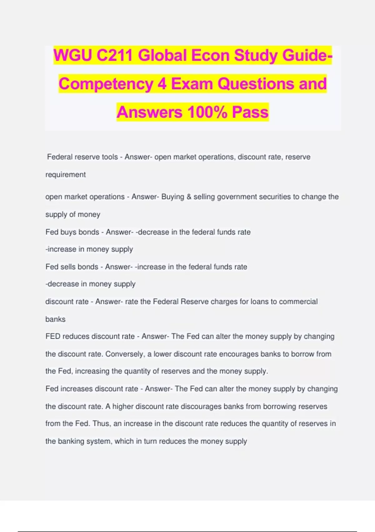 WGU C211 Global Econ Study Guide- Competency 4 Exam Questions and Answers 100% Pass Federal reserve tools - Answer- open market operations, discount rate, reserve requirement open market operations - Answer- Buying & selling government securities to change the supply of money Fed buys bonds - Answer- -decrease in the federal funds rate -increase in money supply Fed sells bonds - Answer- -increase in the federal funds rate -decrease in money supply discount rate - Answer- rate the Federal Reserve charges for loans to commercial banks FED reduces discount rate - Answer- The Fed can alter the money supply by changing the discount rate. Conversely, a lower discount rate encourages banks to borrow from the Fed, increasing the quantity of reserves and the money supply. Fed increases discount rate - Answer- The Fed can alter the money supply by changing the discount rate. A higher discount rate discourages banks from borrowing reserves from the Fed. Thus, an increase in the discount rate reduces the quantity of reserves in the banking system, which in turn reduces the money supply