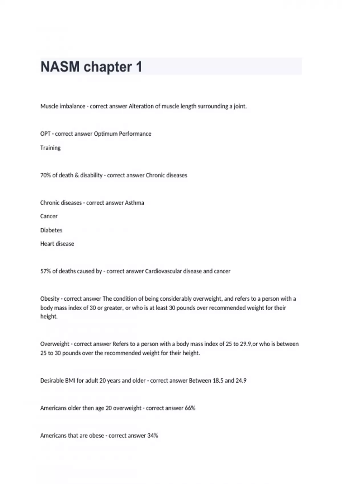 Muscle imbalance - correct answer Alteration of muscle length surrounding a joint. OPT - correct answer Optimum Performance Training 70% of death & disability - correct answer Chronic diseases Chronic diseases - correct answer Asthma Cancer Diabetes Heart disease 57% of deaths caused by - correct answer Cardiovascular disease and cancer Obesity - correct answer The condition of being considerably overweight, and refers to a person with a body mass index of 30 or greater, or who is at least 30 pounds over recommended weight for their height. Overweight - correct answer Refers to a person with a body mass index of 25 to 29.9,or who is between 25 to 30 pounds over the recommended weight for their height. Desirable BMI for adult 20 years and older - correct answer Between 18.5 and 24.9 Americans older then age 20 overweight - correct answer 66% Americans that are obese - correct answer 34% Experts predict how many kids will be overweight by 2015 - correct answer One in four kids BMI - correct answer Body mass index BMI calculation formula - correct answer BMI = 703 x weight(lb)/height (in) BMI is - correct answer A persons weight in pounds divided by height Blood lipids - correct answer Also known as cholesterol and triglycerides, blood lipids are carried by protein molecules known as high-density lipoproteins (HDL) and low-density lipoproteins (LDL). HDL - correct answer High density lipoproteins. "Good cholesterol" Less then 200 mg/dl - correct answer A healthy total cholesterol level LDL - correct answer Low density lipoproteins. "Bad cholesterol" Between 200 and 239 mg/dl - correct answer A borderline high cholesterol level More then 240 mg/dl - correct answer A high-risk cholesterol level How many adults have total cholesterol values of 200 mg/dl or higher - correct answer More then 50% Diabetes affects how many Americans - correct answer Nearly 23 million Diabetes mellitus - correct answer Chronic metabolic disorder caused by insulin deficiency, which impairs carbohydrate usage and enhances usage of fats and proteins. Type 1 diabetes - correct answer Juvenal diabetes symptoms first appear in childhood, pancreas not producing insulin Hyperglycemia - correct answer High blood sugar