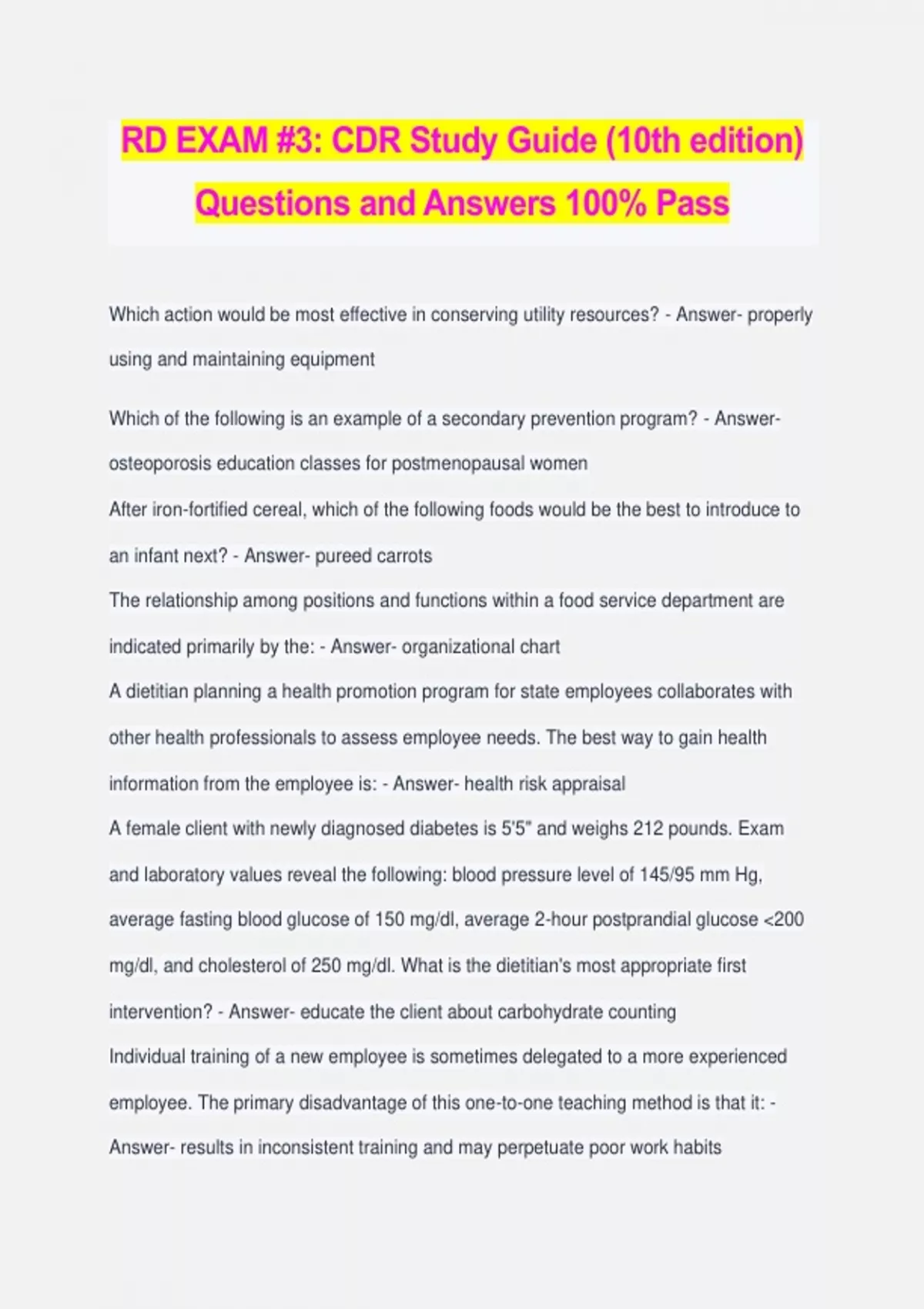 RD EXAM #3: CDR Study Guide (10th edition) Questions and Answers 100% Pass Which action would be most effective in conserving utility resources? - Answer- properly using and maintaining equipment Which of the following is an example of a secondary prevention program? - Answer- osteoporosis education classes for postmenopausal women After iron-fortified cereal, which of the following foods would be the best to introduce to an infant next? - Answer- pureed carrots The relationship among positions and functions within a food service department are indicated primarily by the: - Answer- organizational chart A dietitian planning a health promotion program for state employees collaborates with other health professionals to assess employee needs. The best way to gain health information from the employee is: - Answer- health risk appraisal A female client with newly diagnosed diabetes is 5'5" and weighs 212 pounds. Exam and laboratory values reveal the following: blood pressure level of 145/95 mm Hg, average fasting blood glucose of 150 mg/dl, average 2-hour postprandial glucose <200 mg/dl, and cholesterol of 250 mg/dl. What is the dietitian's most appropriate first intervention? - Answer- educate the client about carbohydrate counting Individual training of a new employee is sometimes delegated to a more experienced employee. The primary disadvantage of this one-to-one teaching method is that it: - Answer- results in inconsistent training and may perpetuate poor work habits During a nutrition assessment before elective surgery, a client reports regularly taking a multiple vitamin, a mineral supplement, and several natural herbal supplements. The dietitian should: - Answer- investigate the supplements and discuss supplement use with a physician A patient with chronic kidney disease on hemodialysis has the following laboratory test results: BUN, 50 mg/dl, albumin, 2.8 g/dl; and calcium, 8 mg/dl. What recommendation should the dietitian make to improve these laboratory values? - Answer- increase protein intake Using the 5-week, simple moving average method of forecasting and the data below, the dietitian will need how many servings for October 7th? Roast beef special--Number of servings consumed September 5 -- 125 September 12 -- 115 September 19 -- 119 September 26 -- 123 October 2 -- 120 October 10 -- 121 - Answer- 120