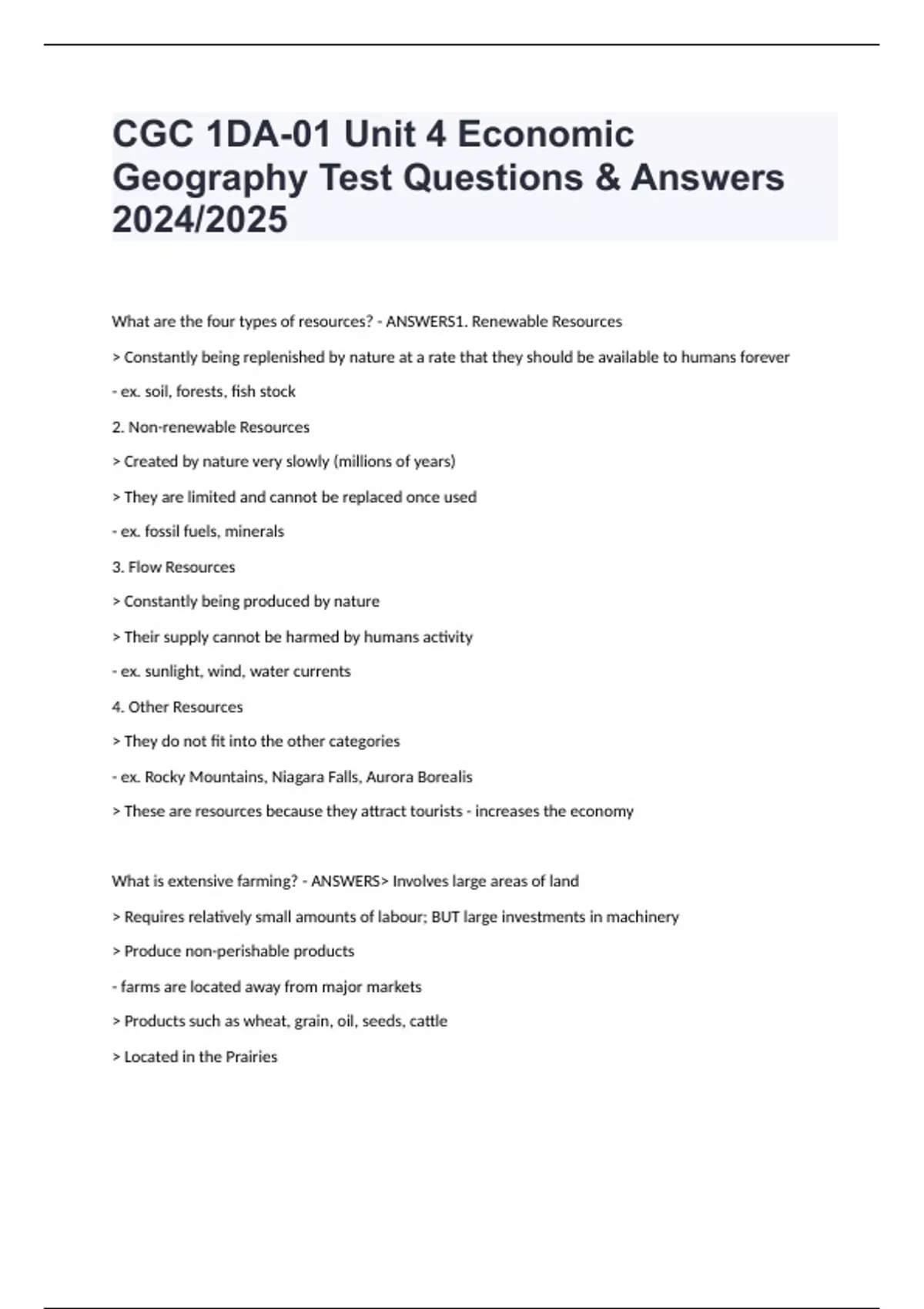 CGC 1DA-01 Unit 4 Economic Geography Test Questions & Answers 2024/2025 What are the four types of resources? - ANSWERS1. Renewable Resources > Constantly being replenished by nature at a rate that they should be available to humans forever - ex. soil, forests, fish stock 2. Non-renewable Resources > Created by nature very slowly (millions of years) > They are limited and cannot be replaced once used - ex. fossil fuels, minerals 3. Flow Resources > Constantly being produced by nature > Their supply cannot be harmed by humans activity - ex. sunlight, wind, water currents 4. Other Resources > They do not fit into the other categories - ex. Rocky Mountains, Niagara Falls, Aurora Borealis > These are resources because they attract tourists - increases the economy What is extensive farming? - ANSWERS> Involves large areas of land > Requires relatively small amounts of labour; BUT large investments in machinery > Produce non-perishable products - farms are located away from major markets > Products such as wheat, grain, oil, seeds, cattle > Located in the Prairies