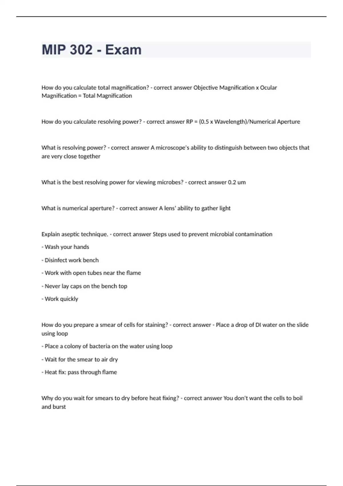 How do you calculate total magnification? - correct answer Objective Magnification x Ocular Magnification = Total Magnification How do you calculate resolving power? - correct answer RP = (0.5 x Wavelength)/Numerical Aperture What is resolving power? - correct answer A microscope's ability to distinguish between two objects that are very close together What is the best resolving power for viewing microbes? - correct answer 0.2 um What is numerical aperture? - correct answer A lens' ability to gather light Explain aseptic technique. - correct answer Steps used to prevent microbial contamination - Wash your hands - Disinfect work bench - Work with open tubes near the flame - Never lay caps on the bench top - Work quickly How do you prepare a smear of cells for staining? - correct answer - Place a drop of DI water on the slide using loop - Place a colony of bacteria on the water using loop - Wait for the smear to air dry - Heat fix: pass through flame Why do you wait for smea