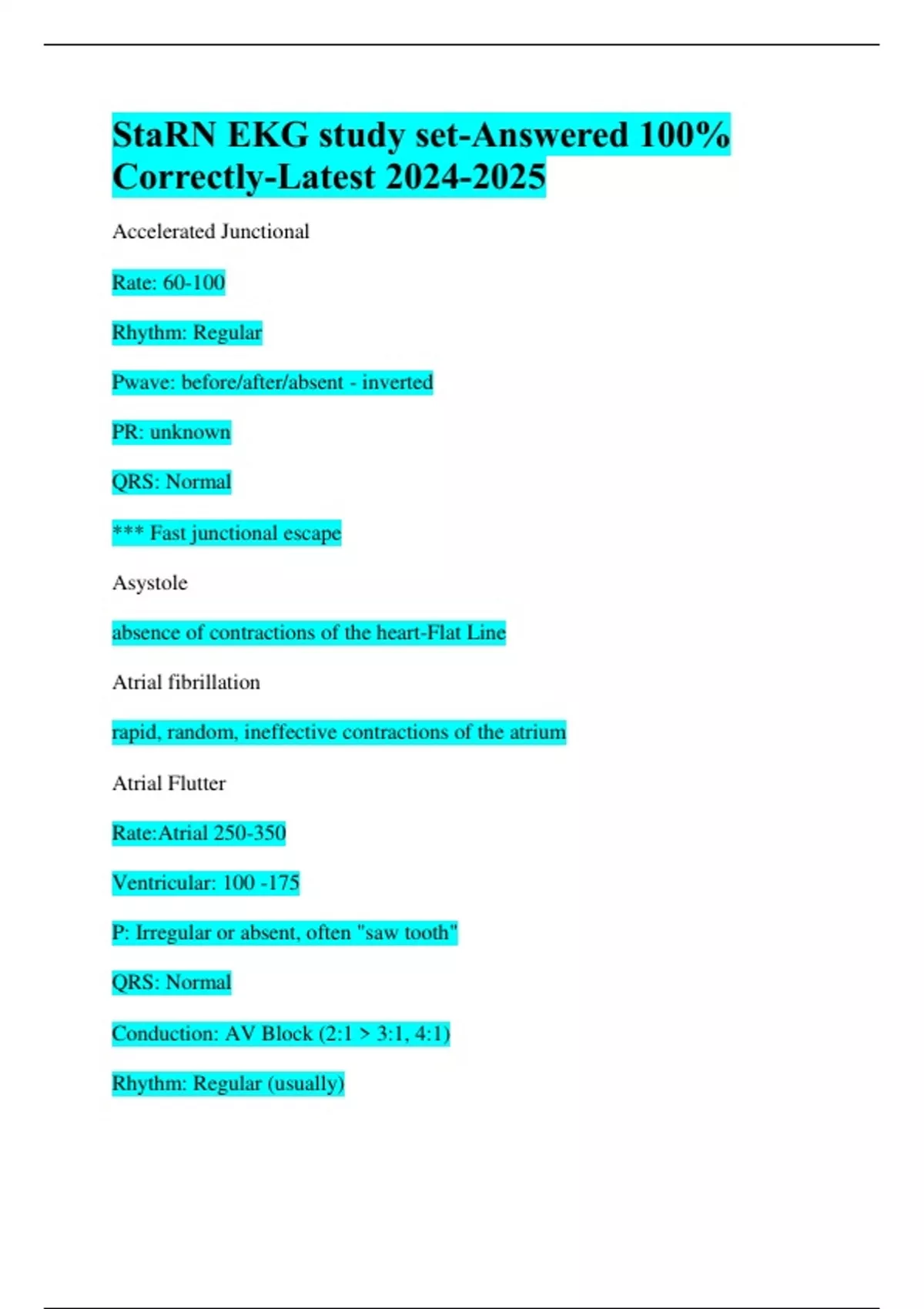 StaRN EKG study set-Answered 100% Correctly-Latest Accelerated Junctional Rate: 60-100 Rhythm: Regular Pwave: before/after/absent - inverted PR: unknown QRS: Normal *** Fast junctional escape Asystole absence of contractions of the heart-Flat Line Atrial fibrillation