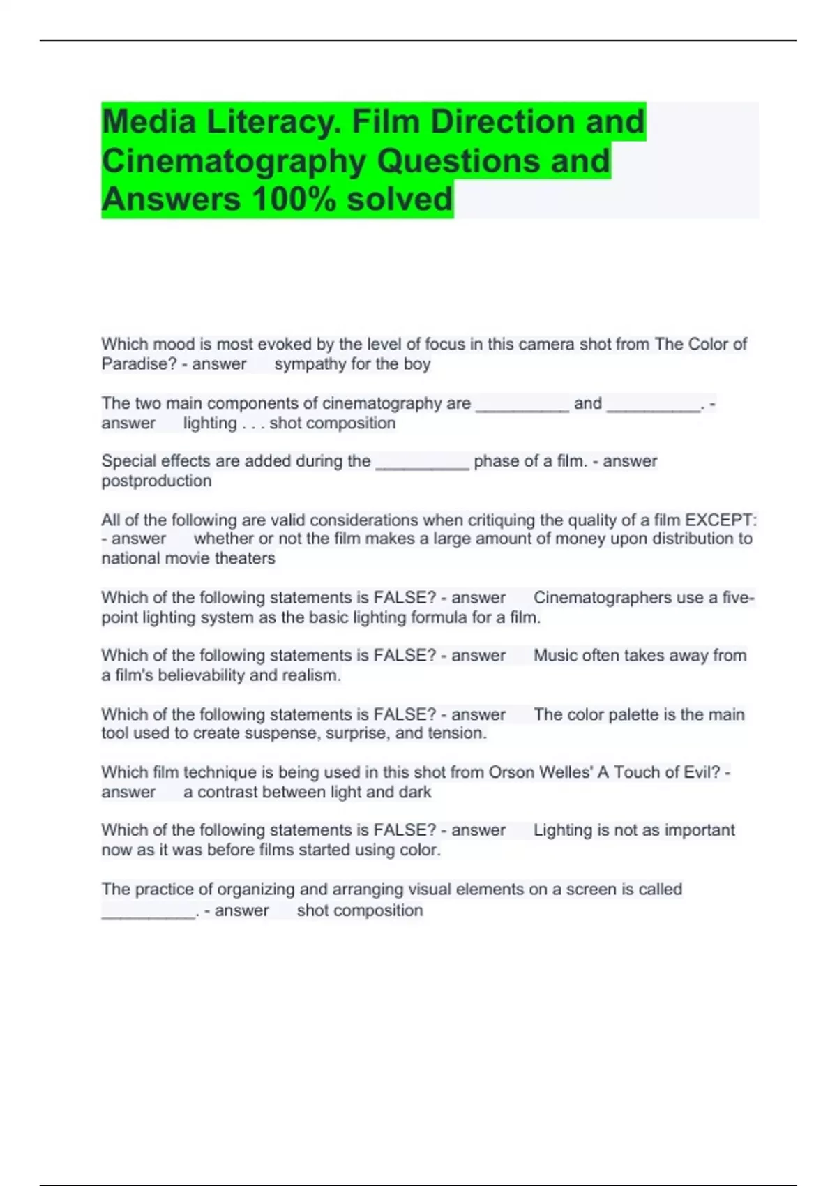 Media Literacy. Film Direction and Cinematography Questions and Answers 100% solved Which mood is most evoked by the level of focus in this camera shot from The Color of Paradise? sympathy for the boy The two main components of cinematography are __________ and __________. lighting . . . shot composition Special effects are added during the __________ phase of a film. postproduction All of the following are valid considerations when critiquing the quality of a film EXCEPT: whether or not the film makes a large amount of money upon distribution to national movie theaters Which of the following statements is FALSE? Cinematographers use a five-point lighting system as the basic lighting formula for a film. Which of the following statements is FALSE? Music often takes away from a film's believability and realism. Which of the following statements is FALSE? The color palette is the main tool used to create suspense, surprise, and tension. Which film technique is being used in this shot from Orson Welles' A Touch of Evil? a contrast between light and dark Which of the following statements is FALSE? Lighting is not as important now as it was before films started using color. The practice of organizing and arranging visual elements on a screen is called __________. shot composition