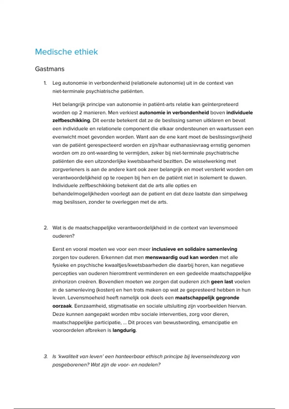 Gedetailleerde uitwerking van alle voorbije examenvragen () van Medische Ethiek. Dit document bevat zowel leerstof van Gastmans als van Dierickx, steeds duidelijk uitgelegd met de belangrijkste begrippen vetgedrukt, met op het einde nog wat extra vragen. Dit is eigenlijk alles wat ik geleerd heb voor het examen en ik was geslaagd. In dit document heeft veel tijd gestoken, ik heb hiervoor informatie uit Gastmans zijn boek, Dierickx zijn cursus én mijn eigen notities gebruikt.