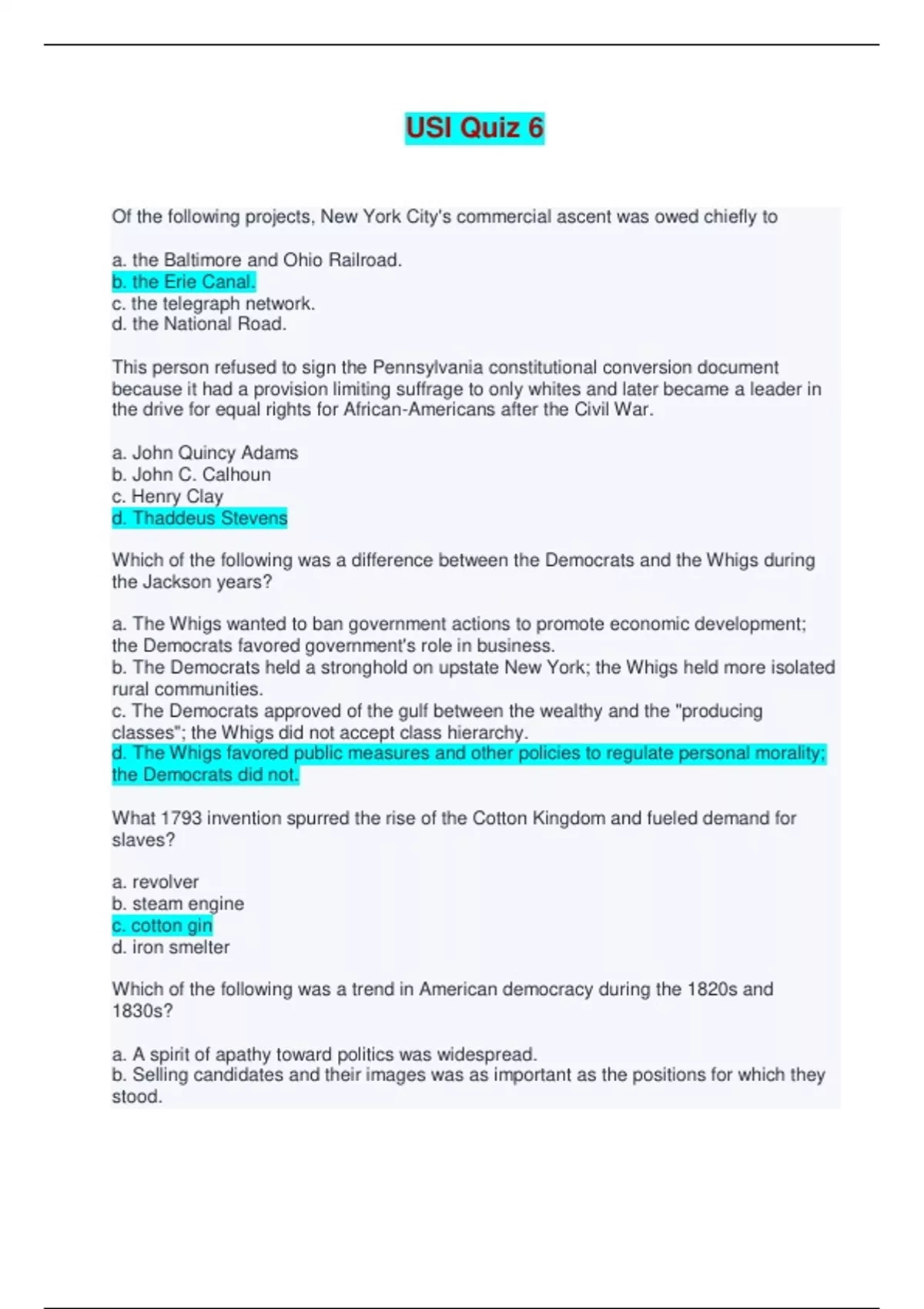 USI Quiz 6 - Questions with Verified Answers Of the following projects, New York City's commercial ascent was owed chiefly to a. the Baltimore and Ohio Railroad. b. the Erie Canal. c. the telegraph network. d. the National Road. This person refused to sign the Pennsylvania constitutional conversion document because it had a provision limiting suffrage to only whites and later became a leader in the drive for equal rights for African-Americans after the Civil War. a. John Quincy Adams b. John C. Calhoun c. Henry Clay d. Thaddeus Stevens Which of the following was a difference between the Democrats and the Whigs during the Jackson years? a. The Whigs wanted to ban government actions to promote economic development; the Democrats favored government's role in business. b. The Democrats held a stronghold on upstate New York; the Whigs held more isolated rural communities. c. The Democrats approved of the gulf between the wealthy and the "producing classes"; the Whigs did not accept class hierarchy. d. The Whigs favored public measures and other policies to regulate personal morality; the Democrats did not. What 1793 invention spurred the rise of the Cotton Kingdom and fueled demand for slaves? a. revolver b. steam engine c. cotton gin d. iron smelter Which of the following was a trend in American democracy during the 1820s and 1830s? a. A spirit of apathy toward politics was widespread. b. Selling candidates and their images was as important as the positions for which they stood. c. The idea of a "common man" and "manliness" decreased in importance for candidates. d. Ironically, as the number of eligible voters rose, voter turnout in elections declined. American industrialization first took off in a. New England. b. the Upper South. c. the Great Lakes region. d. the Southwest. The author of Democracy in America was a. George Washington, from Virginia. b. Alexander Hamilton, originally from the British West Indies. c. Alexis de Tocqueville, from France. d. Herman Melville, from New York City. Which of the following was an innate characteristic of women, according to the "cult of domesticity"? a. submissiveness b. sexual experience and desire c. independence d. analytical insight