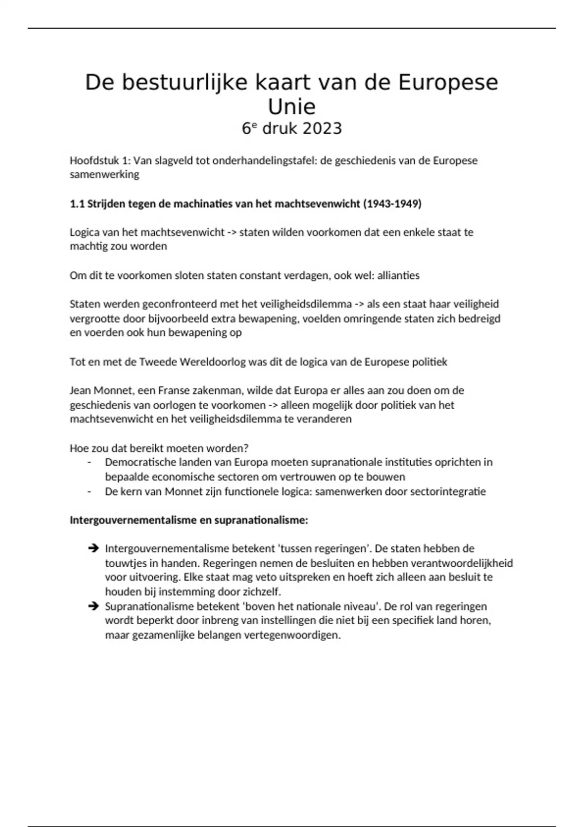 In deze samenvatting behandel ik alle belangrijke informatie en jaartallen uit hoofdstuk 1,2,3,4,5,8,9,10 en 13 uit de 'bestuurlijke kaart van de Europese Unie'. Het is een informatieve en beknopte samenvatting, maar alle essentiële onderdelen komen aan bod. Ideaal voor het leren van een tentamen over Europese politiek.
