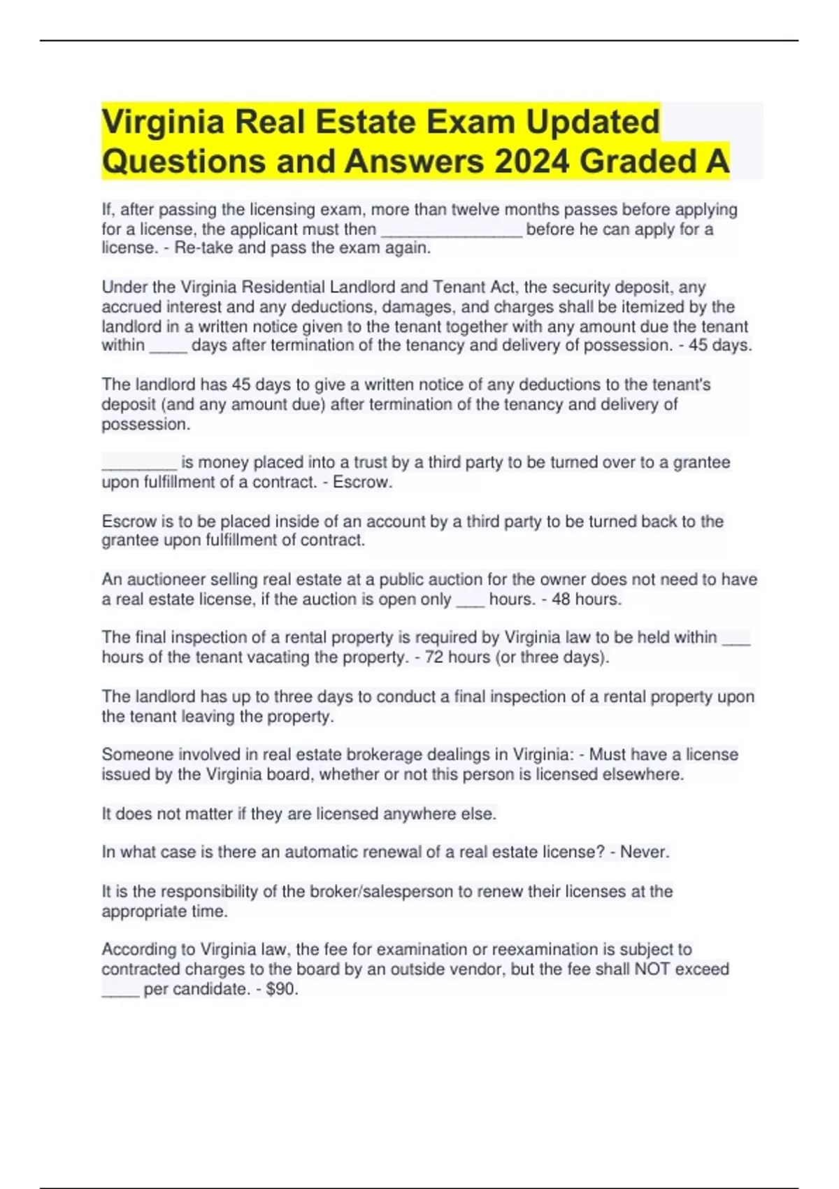 Virginia Real Estate Exam Updated Questions and Answers 2024 Graded A