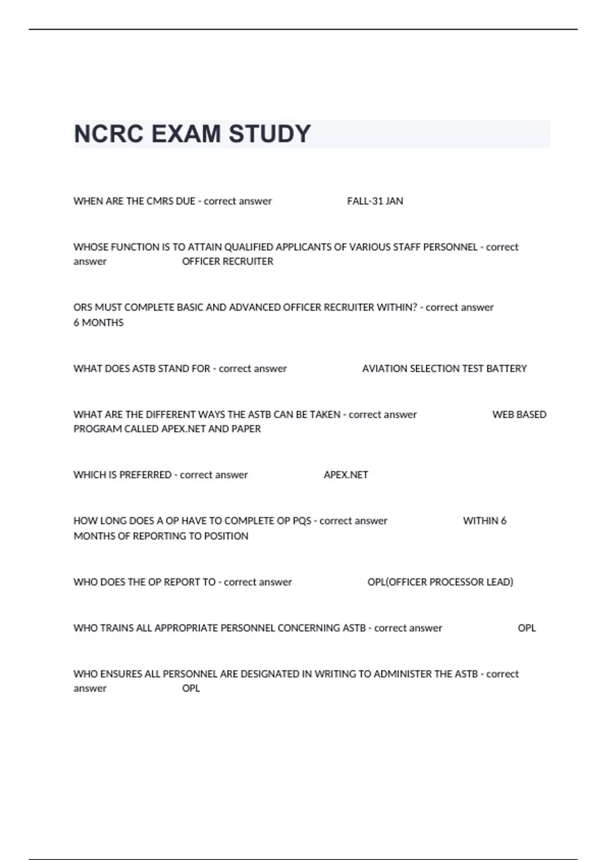 WHEN ARE THE CMRS DUE - correct answer FALL-31 JAN WHOSE FUNCTION IS TO ATTAIN QUALIFIED APPLICANTS OF VARIOUS STAFF PERSONNEL - correct answer OFFICER RECRUITER ORS MUST COMPLETE BASIC AND ADVANCED OFFICER RECRUITER WITHIN? - correct answer 6 MONTHS WHAT DOES ASTB STAND FOR - correct answer AVIATION SELECTION TEST BATTERY WHAT ARE THE DIFFERENT WAYS THE ASTB CAN BE TAKEN - correct answer WEB BASED PROGRAM CALLED APEX.NET AND PAPER WHICH IS PREFERRED - correct answer APEX.NET HOW LONG DOES A OP HAVE TO COMPLETE OP PQS - correct answer WITHIN 6 MONTHS OF REPORTING TO POSITION WHO DOES THE OP REPORT TO - correct answer OPL(OFFICER PROCESSOR LEAD) WHO TRAINS ALL APPROPRIATE PERSONNEL CONCERNING ASTB - correct answer OPL WHO ENSURES ALL PERSONNEL ARE DESIGNATED IN WRITING TO ADMINISTER THE ASTB - correct answer OPL WHAT IS THE OPLQC PQS AND WHO MUST COMPLETE IT AND WHEN - correct answer OFFICER PROCESSOR LEAD QUALITY CONTROL COURSE MUST BE COMPLETED ANUALLY WHILE SERVING AS OPL OPL PQS MUST BE COMPLETED WHEN? - correct answer WHITHIN SIX MONTHS OF ASSUMING THE POSITION WHAT DOES CHPO STAND FOR - correct answer CHAPLAIN PROGRAM OFFICERS WHO ARE CHANGE LETTERS TO 1131.2 SERIES SUBMITTED TO - correct answer N35 IF YOU HAVE QUESTIONS ABOUT THE INTERPRETATION OF THE CRUITMAN THAT YOUR CHAIN OF COMMAND CANNOT ANSWER WHAT HAPPENS - correct answer THE REGION REPRESENTING THE NRD CONTACTS N3 VIOLATION OF THE CRUITMAN SERIES ARE PUNISHIBLE UNDER WHICH ARTICLES OF THE UCMJ - correct answer 84 AND 92 WHERE CAN YOU FIND GUIDANCE ON WHAT CONSTITUTES AN ERRONEOUS OR FRADULENT ENLISTMENT - correct answer MILPERSMAN AND NAVCRUITCOM INSTRUCTIONS ERRONEOUS AND FRADULENT ENLISTMENTS WILL BE SUBMITTED WITH IN HOW MANY DAYS - correct answer 30 DAYS WHICH DEPARTMENT ARE ALL ERRONEOUS AND FRADULENT ENLISTMENTS AND SUBMISSIONS SUBMITTED TO - correct answer N31 WITH COPIES TO NAVCRUITCOM (00IG AND 00J) WHEN AN INVESTIGATION REVEALS AN ERRONEOUS OR FRADULENT ENLISTMENT WHO WILL SUBMIT A LETTER EXPLAINING THE CIRCUMSTANCES - correct answer THE RECRUITER WHOSE RESPONSIBILITY IS IT TO ENSURE THAT ORAMPS IS UPDATED - correct answer OFFICER RECRUITER WHO MAKES TRAVEL ARRANGEMENT FOR APPLICANTS TO ATTEND NUCVIP, MEDVIP, EOV, AND ALL OTHER IN PERSON INTERVIEW - correct answer OFFICER RECRUITER WHO IS RESPONSIBLE FOR INITIAL KIT BUILD OF THE APPLICANT - correct answer OFFICER RECRUITER WHO PROVIDES INPUTS ON ORAMPS TO OACR, R-OPS, AND A-OPS - correct answer OFFICER RECRUITER WHO IS RESPONSIBLE FOR THE INITIAL ONGOING AND FINAL PROCESSING AND QUALITY ASSURANCE OF ALL OFFICER APPLICTIONS - correct answer OP AND OPL WHO IS THE TEST ADMINISTRATOR FOR THE ASTB - correct answer OPL WHO PREPARES TRAVEL ORDERS FOR APPLICANTS FOR OFFICER CANDIDATE SCHOOL - correct answer OPL WHO DOES THE OP AND THE OPL REPORT TO - correct answer OP-OPL OPL REPORTS TO R-OPS AND A-OPS WHO ENSURES COMPLIANCE WITH 1136.2 - correct answer OPL WHAT IS A TA - correct answer NRC NAVET DAT TRANSITION ASSISTANT WHO IS RESPONSIBLE FOR ATTAINING NRS'S NAVET OFFICER GOALS - correct answer NRC NAVET DAT TRANSITION ASSISTANT (TA) WHERE TO FIND THE PENALTY FOR WILLINGLY ENLISTING UNFIT APPLICANTS - correct answer ARTICLE 84
