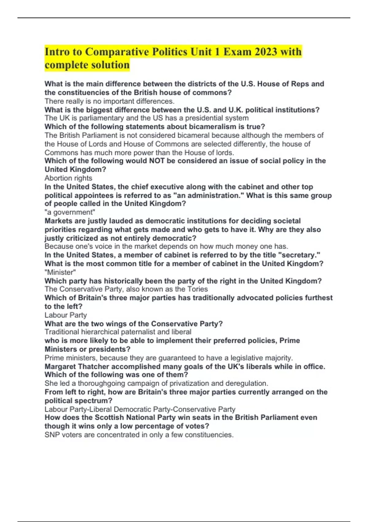 What is the biggest difference between the U.S. and U.K. political institutions?