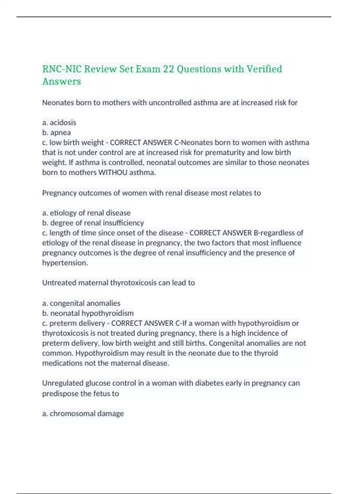 RNC-NIC Review Set Exam 22 Questions with Verified Answers Neonates born to mothers with uncontrolled asthma are at increased risk for a. acidosis b. apnea c. low birth weight - CORRECT ANSWER C-Neonates born to women with asthma that is not under control are at increased risk for prematurity and low birth weight. If asthma is controlled, neonatal outcomes are similar to those neonates born to mothers WITHOU asthma. Pregnancy outcomes of women with renal disease most relates to a. etiology of renal disease b. degree of renal insufficiency c. length of time since onset of the disease - CORRECT ANSWER B-regardless of etiology of the renal disease in pregnancy, the two factors that most influence pregnancy outcomes is the degree of renal insufficiency and the presence of hypertension. Untreated maternal thyrotoxicosis can lead to a. congenital anomalies b. neonatal hypothyroidism c. preterm delivery - CORRECT ANSWER C-If a woman with hypothyroidism or thyrotoxicosis is not treated during pregnancy, there is a high incidence of preterm delivery, low birth weight and still births. Congenital anomalies are not common. Hypothyroidism may result in the neonate due to the thyroid medications not the maternal disease. Unregulated glucose control in a woman with diabetes early in pregnancy can predispose the fetus to a. chromosomal damage b. embryonic growth delays c. teratogenic effects - CORRECT ANSWER C-Preconception counseling and early prenatal care are essential for women with diabetes when contemplating childbirth. Uncontrolled glucose levels early in pregnancy can lead to organogenesis and the development of congenital anomalies. Infants with fetal alchohol syndrome demonstrate tremors, irritability and hypertonus due to a. central nervous system injury b. interferance with protein synthesis c. withdrawal from alcohol - CORRECT ANSWER C-Infants born with fetal alcohol syndrome usually presents with tremors, irritability, and hypertonus. These symptoms are primarily due to alcohol withdrawal. Common manifestations of neonates who were exposed to cocaine in utero include a. apnea and lethargy b. neonatal abstinence syndrome c. touch aversion and overstimulation - CORRECT ANSWER C-Exposure to cocaine in utero leaves infants with a wide variety of problems. Teratogenicity has had some association with cocaine exposure but its direct link has not not been confirmed. Neonates are hypertonic, irritable and easily overstimulated by sensory input or direct contact. To avoid any stimulation, the neonate may totally shut down going into a deep sleep or alternatively the infant may cry incessantly. There is no specific pattern of withdrawal as there is with neonatal abstinence syndrome and heroin exposure. The primary route of the transmission of neonatal systemic lupus erythematosus is a. familial tendency b. multifactorial inheritance c. placental transfer of antibodies - CORRECT ANSWER C-Neonates born to mothers with systemic lupus erythematosus can demonstrate various symptoms, known as neonatal systemic lupus erythematosus. These include rash, thrombocytopenia and cardiac abnormalities, specificallly congenital heart block. The attributed antecedent for neonatal disease is placental transfer of anti-bodies from mother to fetus. In a 34 week gestational age neonate, the expected muscle development would indicate a a. complete Moro reflex b. poor grasp reflex c. weak sucking reflex - CORRECT ANSWER A-At 34 weeks of gestation, the examination of muscle tone development would include: strong synchronized sucking reflex, a strong grasp reflex, complete Moro reflex and good extension with no tendency to adduction. A physical finding consistent with prematurity is a. abundant lanuga b. accelerated plantar creasing c. stippled areola with raised edges - CORRECT ANSWER A-External criteria of determination of gestational age involve a wide variety of physical parameters including: presence of edema, skin texture, color and opacity, presence of lanugo, plantar creases, nipple formation and amount of breast tissue, ear form and firmness and appearance of genitalia. Based on the options provided in the question, the abundant lanugo is consistent with prematurity. As the infant achieves a greater gestational age, lanugo diminishes. Plantar creases are not prominent in the premature infant and becomes more pronounced with increasing gestational age. The nipples of premature infants are usually flat with no definition. Three neonates are plotted on a growth curve shown. Because of weight and gestational age, they are at increased risk for a. Congenital anomalies b. hypoglycemia c. respiratory distress syndrome - CORRECT ANSWER A-Of the choices given, the only risk all these babies share is increased of congenital anomalies. Hypoglycemia no RDS is increased for Baby B who is term, AGA. Baby C, who is post-term, is not at risk for RDS. When performing a gestational age assessment, the nurse should recognize that a finding that correlates with advancing gestational age is increased a. degree of arm flexion with arm recoil maneuver b. resistance with scarf sign maneuver c. square window angle - CORRECT ANSWER B-In gestational age assessment, the degress of arm flexion or arm recoil decreases with advancing gestational age as does the square window angle. With scarf sign maneuver, increased resistance correlates with advancing gestational age. A neonate can be assumed to be at and an advanced gestational age if neuromuscular development demonstrates increased a. hip flexion and adduction b. popliteal angle c. square window angle measurement - CORRECT ANSWER A-Neuromuscular criteria can be a good indicator of gestational age. Those findings that indicate advanced gestational age include increased hip flexion and adduction, decreased square angle, flexed response to arm recoil, increasing resistance with scarf sign maneuver and a low popliteal angle. In examining the black newborn's eyes, a bright light directed toward 
