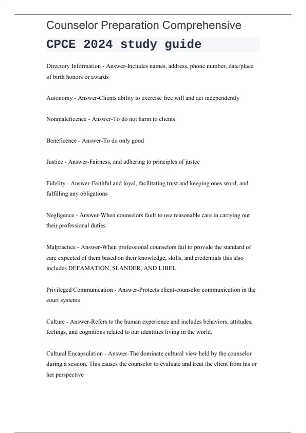 Counselor Preparation Comprehensive. CPCE 2024 study guide