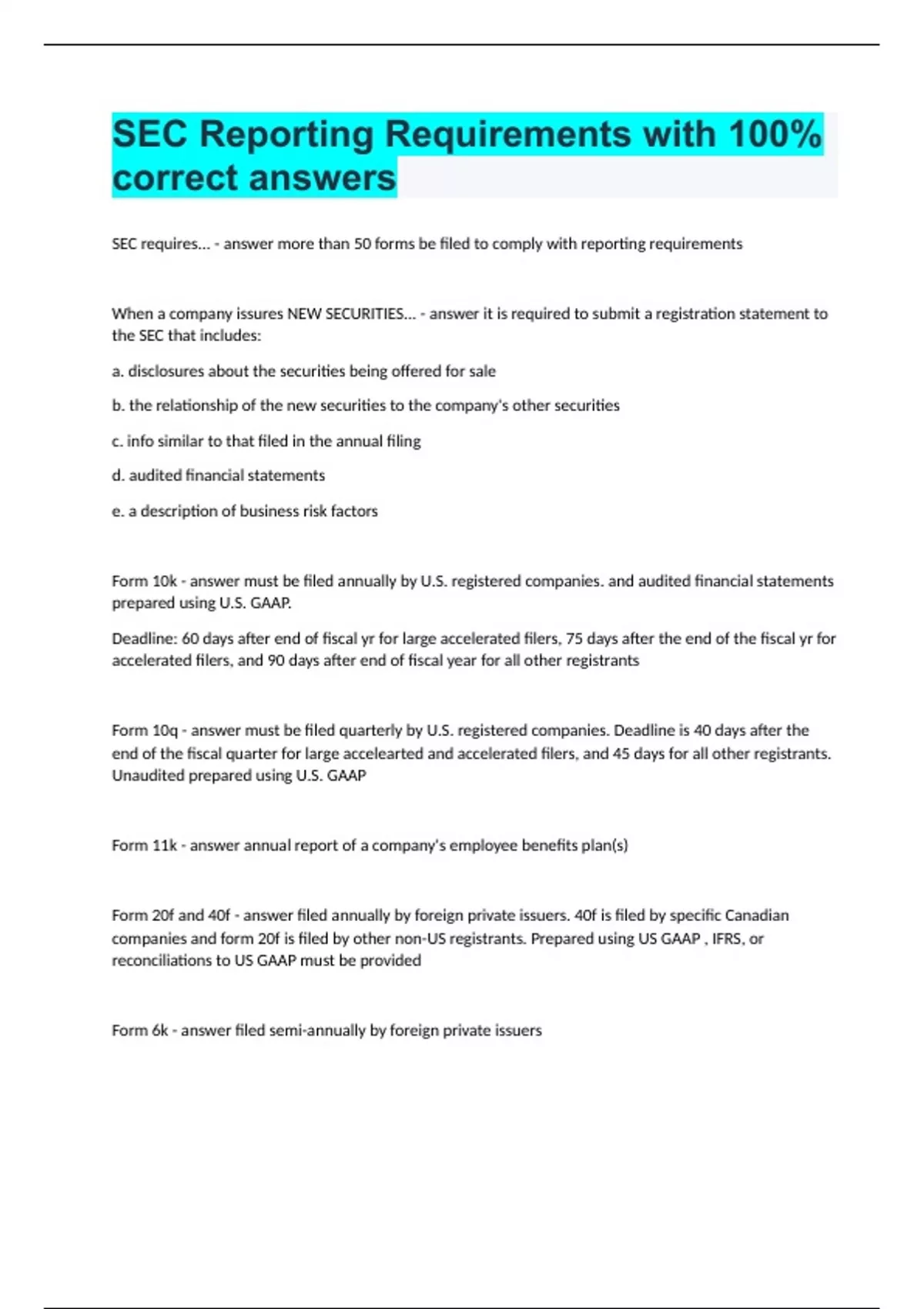 SEC requires... more than 50 forms be filed to comply with reporting requirements When a company issures NEW SECURITIES... it is required to submit a registration statement to the SEC that includes: a. disclosures about the securities being offered for sale b. the relationship of the new securities to the company's other securities c. info similar to that filed in the annual filing d. audited financial statements e. a description of business risk factors Form 10k must be filed annually by U.S. registered companies. and audited financial statements prepared using U.S. GAAP. Deadline: 60 days after end of fiscal yr for large accelerated filers, 75 days after the end of the fiscal yr for accelerated filers, and 90 days after end of fiscal year for all other registrants Form 10q must be filed quarterly by U.S. registered companies. Deadline is 40 days after the end of the fiscal quarter for large accelearted and accelerated filers, and 45 days for all other registrants. Unaudited prepared using U.S. GAAP Form 11k annual report of a company's employee benefits plan(s) Form 20f and 40f filed annually by foreign private issuers. 40f is filed by specific Canadian companies and form 20f is filed by other non-US registrants. Prepared using US GAAP , IFRS, or reconciliations to US GAAP must be provided Form 6k filed semi-annually by foreign private issuers Form 8k filed to report major corporate events such as asset acquisitions or disposals, changes in securities and trading markets, changes to accountants or financial statements, and changes in corporate goverance or management Forms 3,4,and 5 required to be filed by directors, officers, or beneficial owners of more than 10% of a class of equity securities of a registered company Regulation S-X the SEC sets forth the "form and content" of and requirements for interim and annual financial statments to be filed with the SEC Interim Financial Statements filed with the SEC.. must be reviewed by an independent public accountant and the review report must be filed with the FS. Interim Financial statements must include.. Balance Sheets as of the end of the most recent fiscal quarter and as of the end of the preceding fiscal yr. Income Statements for the most recent fiscal quarter for the period between the end of the preceding fiscal year and the end of the most recent fiscal quarter and the corresponding periods of the preceding fiscal year. Statements of Cash Flows for the period between the end of the preceding fiscal year and the end of the most recent fiscal quarter and for the corresponding period for the preceding fiscal year. US-quarterly Foreign -Semiannually Interim financial statements may be condensed financial statements Annual financial statements filed with the SEC must be audited by an independent public accountant Audited Financial statements must include .. balance sheets for the two most recent fiscals years and statements of income, changes in owners equity, and cash flows for each of the three fiscal years preceding the date of the most recent audited balance sheet Definition of XBRL software that uses data tags to describe financial information for business and financial reporting... tells computers how to interpret the context of the text Tag provide contextual information that allow data to be recognized and processed by software Taxonomy specific tags used for individual items of business and financial data SEC's interactive Data Rule requires U.S. public companies and foreign private issuers to present financial statements and any applicable financial statement schedules in an exhibit prepared using XBRL Tagged disclosures must include the primary financial statements, notes, and financial statement schedules
