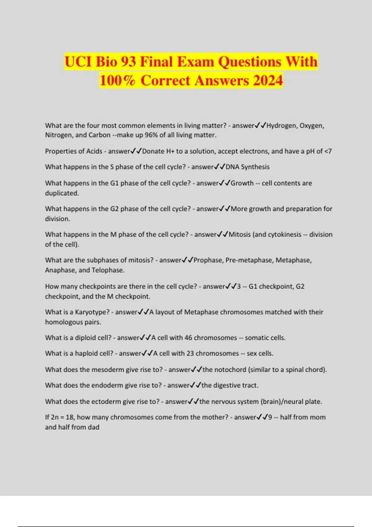 UCI Bio 93 Final Exam Questions With 100% Correct Answers 2024 What are the four most common elements in living matter? - answerHydrogen, Oxygen, Nitrogen, and Carbon --make up 96% of all living matter. Properties of Acids - answerDonate H+ to a solution, accept electrons, and have a pH of <7 What happens in the S phase of the cell cycle? - answerDNA Synthesis What happens in the G1 phase of the cell cycle? - answerGrowth -- cell contents are duplicated. What happens in the G2 phase of the cell cycle? - answerMore growth and preparation for division. What happens in the M phase of the cell cycle? - answerMitosis (and cytokinesis -- division of the cell). What are the subphases of mitosis? - answerProphase, Pre-metaphase, Metaphase, Anaphase, and Telophase. How many checkpoints are there in the cell cycle? - answer3 -- G1 checkpoint, G2 checkpoint, and the M checkpoint. What is a Karyotype? - answerA layout of Metaphase chromosomes matched with their homologous pairs. What is a diploid cell? - answerA cell with 46 chromosomes -- somatic cells. What is a haploid cell? - answerA cell with 23 chromosomes -- sex cells. What does the mesoderm give rise to? - answerthe notochord (similar to a spinal chord). What does the endoderm give rise to? - answerthe digestive tract. What does the ectoderm give rise to? - answerthe nervous system (brain)/neural plate. If 2n = 18, how many chromosomes come from the mother? - answer9 -- half from mom and half from dad Meiosis - answerMeiosis is a specialized type of cell division that reduces the chromosome number by half, creating four haploid cells, each genetically distinct from the parent cell that gave rise to them. What two structures does the chiasma connect? - answerNon-sister chromatids. What are the steps of meiosis? - answerProphase I, Metaphase I, Anaphase I, Telophase I & cytokinesis (then a second set of phases) What does meiosis 1 deal with? - answerhomologous chromosomes. What happens in prophase 1? - answerThe chromosomes condense, the nuclear envelope breaks down, chromosomes cross over, and meiotic spindle forms. What happens in metaphase 1? - answerthe pairs of homologous chromosomes are now tightly condensed and coiled and become arranged on the metaphase plate. What happens in anaphase 1? - answerthe pairs of chromosomes are pulled apart by the spindle fibers (microtubules). What happens in Telophase 1 and cytokinesis? - answerThe homologous chromosome pairs complete their migration to the two poles as a result of the action of the spindle. Now a haploid set of chromosomes is at each pole, with each chromosome still having two chromatids. A nuclear envelope reforms around each chromosome set, the spindle disappears, and cytokinesis follows. What happens during meiosis 2? - answersister chromatids separate. What happens in prophase 2 of meiosis? - answerA new spindle forms around the chromosomes. What happens in metaphase 2 of meiosis? - answerMetaphase 2 chromosomes line up at the equator. What happens in anaphase 2 of meiosis? - answerCentromeres divide chromatids move to opposite poles of the cells. What happens during telophase 2 of meiosis? - answerA nuclear envelope forms around each set of chromosomes and the cytoplasm divides. What makes meiosis a unique form of cell division - answerSynapsis and crossing over -- occurs in prophase 1, pairing up of homologous chromosomes, homologous chromosomes cross over and exchange corresponding genetic information (the DNA exchanged contain the same genes, but may have different alleles). How does meiosis increase genetic variability? - answerIndependent assortment (meiosis 1 -- homologous chromosomes separate independently), crossing over (genetic recombination, prophase 1), and random fertilization (any egg can join with any sperm -- most effective way to obtain genetic variability). What is the law of segregation? - answerAlleles coding for the same trait separate independently during gamete formation. What is non-disjunction? - answerWhen homologous chromosomes or sister chromatids do not separate properly. What is a character? - answerAn observable heritable feature that may vary among individuals. Ex: flower color. What is a trait? - answerOne of two or more detectable variants in a genetic character. Ex: purple flower color/white flower color. What does the blending theory state? Is this true? - answerThe offspring is a blend of both parents (ex: a tall mom giraffe + a short dad giraffe = a medium height giraffe). This is not true because if so, every single offspring would look the same. What does particulate inheritance state? Is this true? - answerDifferent traits are inherited in separate distinct units (genes) (ex: F1 and F2 generations). This is always true because of not every offspring looks the exact same (has the exact same genetics). What is an allele? - answerAn alternate form of a gene (ex: the gene that determines hair color). What does the Law of Segregation state? - answerThe Law of Segregation states that two alleles in a pair segregate into different gametes. (this deals with separation of homologous pairs in Meiosis 1 producing haploid daughter cells after Meiosis 1). What does Independent Assortment state? - answerEach pair of alleles assort/segregate separately from each other during gamete formation. AKA no gene linkage. What did Mendelian Genetics assume? - answerGregor Mendel, through his work on pea plants, discovered the fundamental laws of inheritance. He deduced that genes come in pairs and are inherited as distinct units, one from each parent. Mendel tracked the segregation of parental genes and their appearance in the offspring as dominant or recessive traits. What is a dominant allele? - answerAn allele that is fully expressed in the phenotype of the heterozygote. What is a recessive allele? - answerAn allele whose phenotypic effect is not observed in the heterozygote.