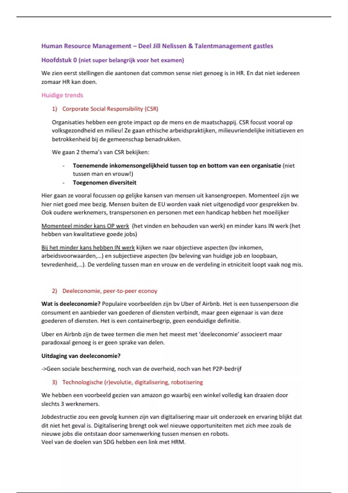 Complete samenvatting van deel 1 van HRM ( deel van Jill Nelissen en les over talent management van gastspreker. Met notities uit de les