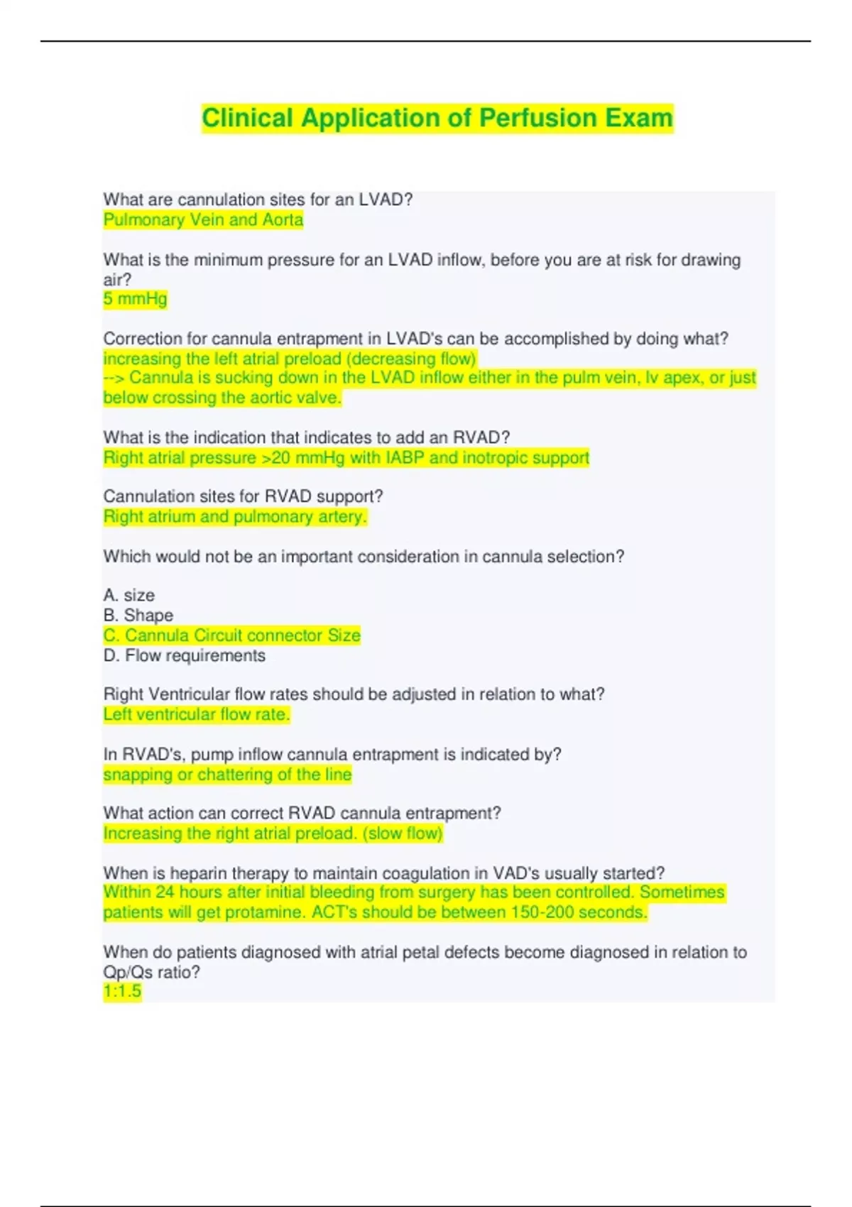 Clinical Application of Perfusion Exam - Questions with Verified Answers What are cannulation sites for an LVAD? Pulmonary Vein and Aorta What is the minimum pressure for an LVAD inflow, before you are at risk for drawing air? 5 mmHg Correction for cannula entrapment in LVAD's can be accomplished by doing what? increasing the left atrial preload (decreasing flow) --> Cannula is sucking down in the LVAD inflow either in the pulm vein, lv apex, or just below crossing the aortic valve. What is the indication that indicates to add an RVAD? Right atrial pressure >20 mmHg with IABP and inotropic support Cannulation sites for RVAD support? Right atrium and pulmonary artery. Which would not be an important consideration in cannula selection? A. size B. Shape C. Cannula Circuit connector Size D. Flow requirements Right Ventricular flow rates should be adjusted in relation to what? Left ventricular flow rate. In RVAD's, pump inflow cannula entrapment is indicated by? snapping or chattering of the line What action can correct RVAD cannula entrapment? Increasing the right atrial preload. (slow flow) When is heparin therapy to maintain coagulation in VAD's usually started? Within 24 hours after initial bleeding from surgery has been controlled. Sometimes patients will get protamine. ACT's should be between 150-200 seconds. When do patients diagnosed with atrial petal defects become diagnosed in relation to Qp/Qs ratio? 1:1.5 What would normal urine output for a child who weighs 12 kg be? What is the standard for urine output in cardiac patients? ~20 ml/hour In cardiac patients it is suggest that urine output should be .5-1.0 ml/kg/hour What is the estimated blood volume of a child who weighs 12 kg? 75 * 12= 900 ml clinical manual of perfusion states that blood volume for a 11-20 kg child should be 80 ml/kg A 2 year old child weighting 12 kg is going on bypass. Prebypas Hct is 40% and priming volume is 1200 ml what is the diluted hematocrit? ((1275)40)/((12*75)+1200)= 17.1% How is venous cannulation usually done in repair of an ASD? bicaval cannulation Upon going onto bypass pressure will drop in direct proportion to what? viscosity Flow=perf pressure/(vasc resistance x viscosity) Which of the following would most likely be used to treat hypotension on a Jehovah witness patient who requests no blood products be utilized. a) aramine b) ephedrine c) neosynephrine d) regitine 2 yr old 12 kg child is placed on complete bypass, when RA is opened large amount of venous blood is present. What is the cause? Persistent left superior vena cava During CPB arterial blood gas for 2 yr old 12 kg patient: pH 7.35, pO2 188 mmHg, pCO2 27 mmHg. increase blood flow, decrease sweep, give NaHCO3 What best characterizes cold agglutinin disease? a) collagen vascular disease b) serum antibody disease c) bacterial infection d) autosomal dominant trait cold agglutinins is an auto immune disease Clinical signs of cold agglutinins include a) acute onset shivering b)erythematous rash c) Acrocyanosis of the digits d) piloerection piloerection is hair standing up on arms and legs. stupid trick answer. What is the most clinically relevant characteristic of cold agglutinins? Thermal Amplitude A clinically insignificant cold agglutinin characteristic would be? a) irreversible agglutination b) complement binding c) hemolysis d) peak activity at 0-4 degrees celsius D. peak activity at 0-4 degrees celsius. It is usually considered clinically insignificant if the thermal amplitude test is less than 30 C. What causes cold agglutinin manifestation? low critical temperatures. What of the following is a pre-operative indication for IABP support? a) a fib b) transient ischemic attack c) Ao dissection d) post infraction angina Which is a contraindication of a balloon pump? a) RV dysfunction b) vent arryth. c) Ao regurg d) bivent. fail IABP would cause blood to be pushed back into the left ventricle. Where should the IABP balloon be position in aorta before pumping begins? In the descending aorta just distal to the left subclavian artery base. In a patient recommended for a CABG what type of venous cannulation should be used.