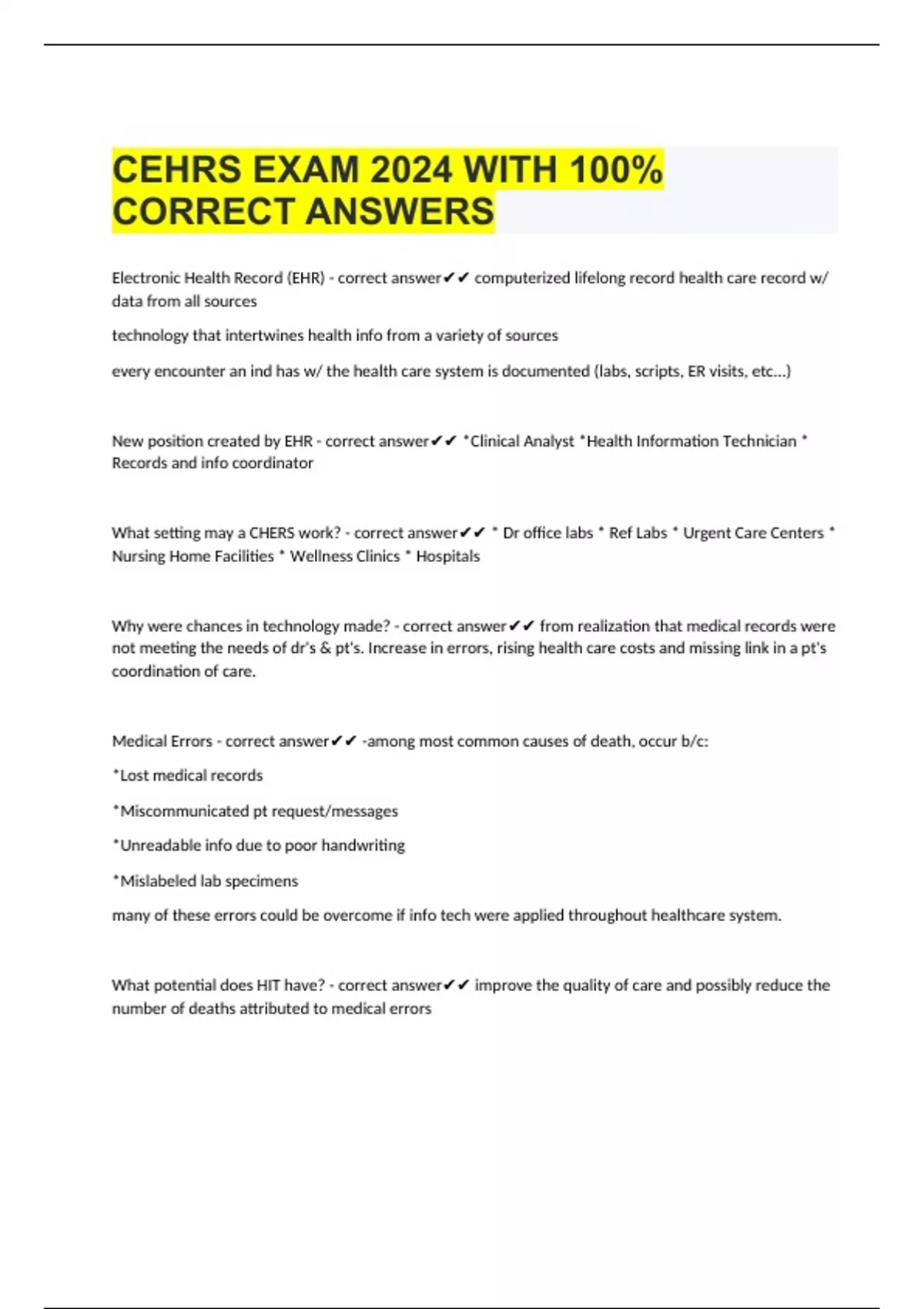 CEHRS EXAM 2024 WITH 100% CORRECT ANSWERS Electronic Health Record (EHR) - correct answer computerized lifelong record health care record w/ data from all sources technology that intertwines health info from a variety of sources every encounter an ind has w/ the health care system is documented (labs, scripts, ER visits, etc...) New position created by EHR - correct answer *Clinical Analyst *Health Information Technician * Records and info coordinator What setting may a CHERS work? - correct answer * Dr office labs * Ref Labs * Urgent Care Centers * Nursing Home Facilities * Wellness Clinics * Hospitals Why were chances in technology made? - correct answer from realization that medical records were not meeting the needs of dr's & pt's. Increase in errors, rising health care costs and missing link in a pt's coordination of care. Medical Errors - correct answer -among most common causes of death, occur b/c: *Lost medical records *Miscommunicated pt request/messages *Unreadable info due to poor handwriting *Mislabeled lab specimens many of these errors could be overcome if info tech were applied throughout healthcare system. What pot