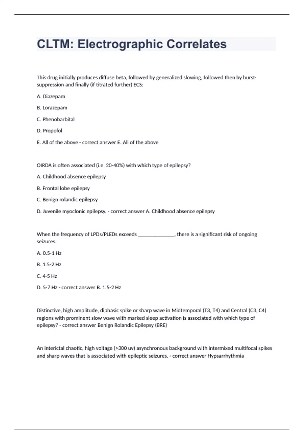 CLTM Electrographic Correlates Question and answers already passed 2024 This drug initially produces diffuse beta, followed by generalized slowing, followed then by burst-suppression and finally (if titrated further) ECS: A. Diazepam B. Lorazepam C. Phenobarbital D. Propofol E. All of the above - correct answer E. All of the above OIRDA is often associated (i.e. 20-40%) with which type of epilepsy? A. Childhood absence epilepsy B. Frontal lobe epilepsy C. Benign rolandic epilepsy D. Juvenile myoclonic epilepsy. - correct answer A. Childhood absence epilepsy When the frequency of LPDs/PLEDs exceeds _____________, there is a significant risk of ongoing seizures. A. 0.5-1 Hz B. 1.5-2 Hz C. 4-5 Hz D. 5-7 Hz - correct answer B. 1.5-2 Hz Distinctive, high amplitude, diphasic spike or sharp wave in Midtemporal (T3, T4) and Central (C3, C4) regions with prominent slow wave with marked sleep activation is associated with which type of epilepsy? - correct answer Benign Rolandic Epilepsy (BRE)