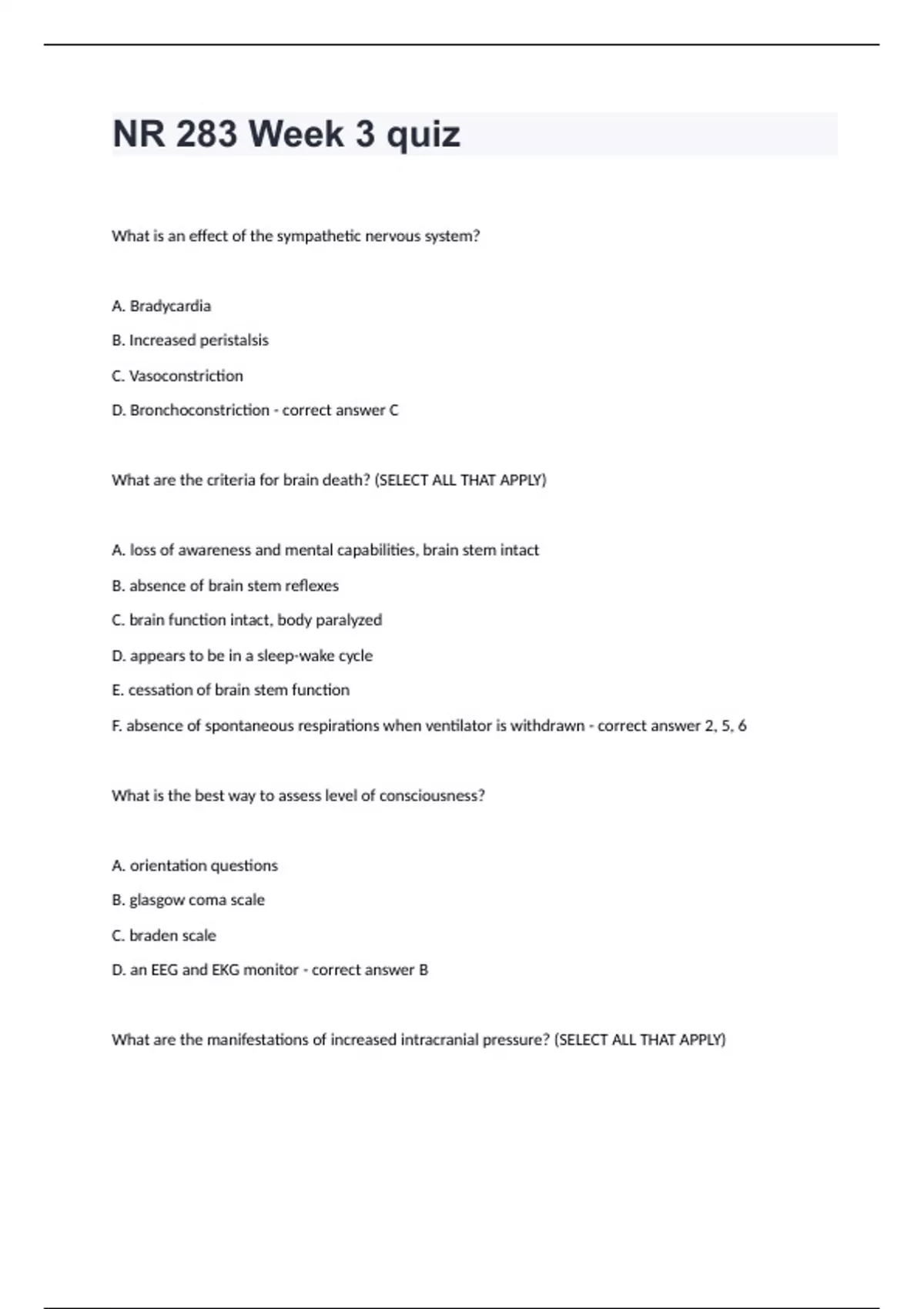 NR 283 Week 3 quizWhat is an effect of the sympathetic nervous system? A. Bradycardia B. Increased peristalsis C. Vasoconstriction D. Bronchoconstriction - correct answer C What are the criteria for brain death? (SELECT ALL THAT APPLY) A. loss of awareness and mental capabilities, brain stem intact B. absence of brain stem reflexes C. brain function intact, body paralyzed D. appears to be in a sleep-wake cycle E. cessation of brain stem function F. absence of spontaneous respirations when ventilator is withdrawn - correct answer 2, 5, 6 What is the best way to assess level of consciousness? A. orientation questions B. glasgow coma scale C. braden scale D. an EEG and EKG monitor - correct answer B What are the manifestations of increased intracranial pressure? (SELECT ALL THAT APPLY)