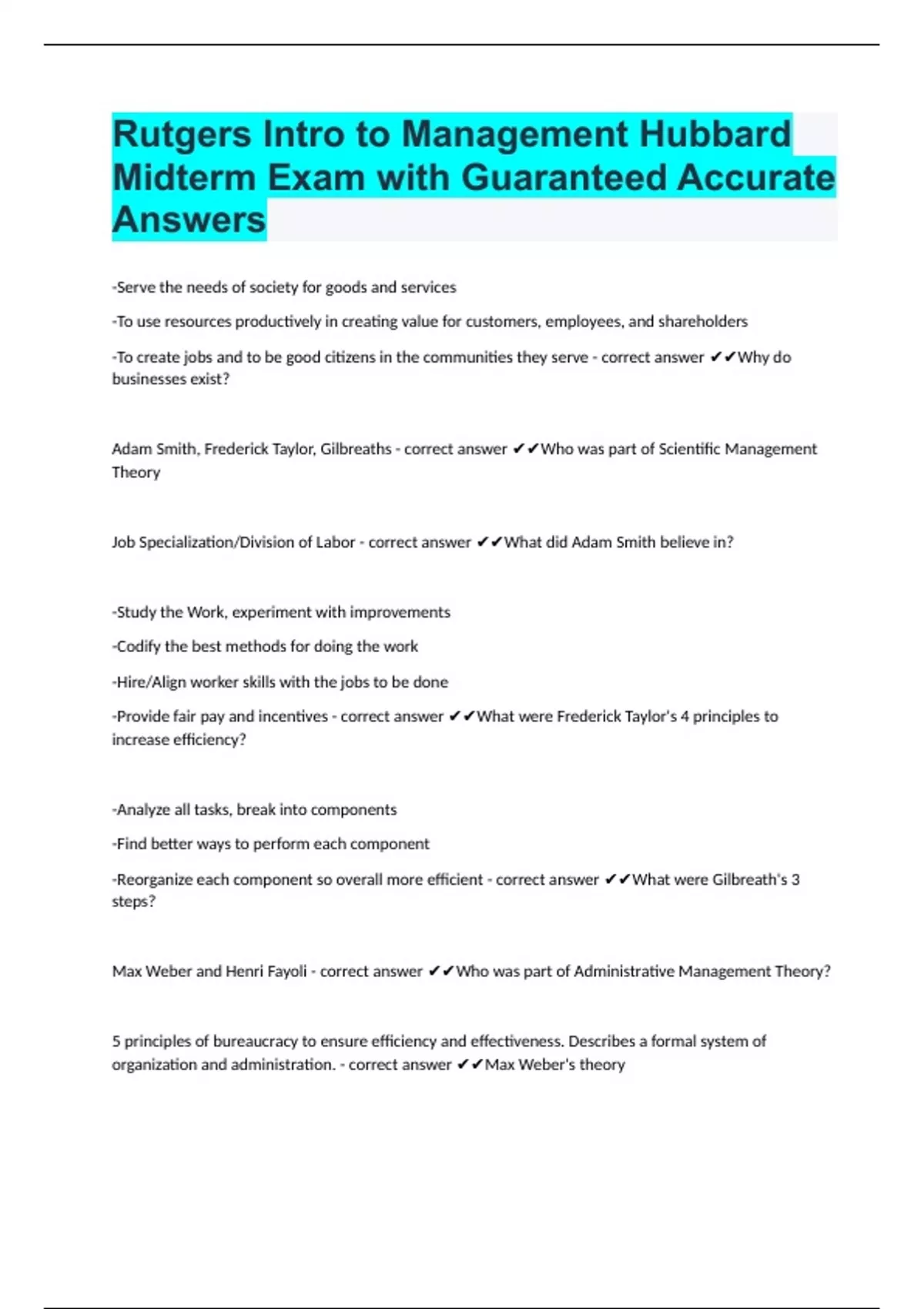 Rutgers Intro to Management Hubbard Midterm Exam with Guaranteed Accurate Answers