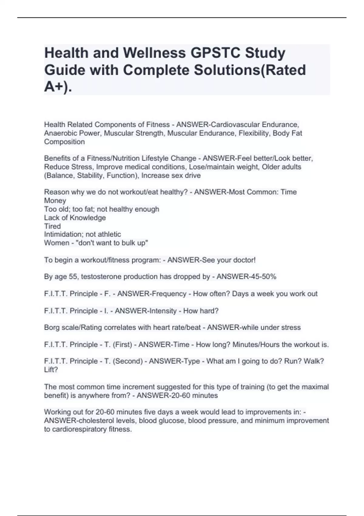Health and Wellness GPSTC Study Guide with Complete Solutions(Rated A+).Health Related Components of Fitness - ANSWER-Cardiovascular Endurance, Anaerobic Power, Muscular Strength, Muscular Endurance, Flexibility, Body Fat Composition Benefits of a Fitness/Nutrition Lifestyle Change - ANSWER-Feel better/Look better, Reduce Stress, Improve medical conditions, Lose/maintain weight, Older adults (Balance, Stability, Function), Increase sex drive Reason why we do not workout/eat healthy? - ANSWER-Most Common: Time Money Too old; too fat; not healthy enough Lack of Knowledge Tired Intimidation; not athletic Women - "don't want to bulk up" To begin a workout/fitness program: - ANSWER-See your doctor! By age 55, testosterone production has dropped by - ANSWER-45-50% F.I.T.T. Principle - F. - ANSWER-Frequency - How often? Days a week you work out F.I.T.T. Principle - I. - ANSWER-Intensity - How hard? Borg scale/Rating correlates with heart rate/beat - ANSWER-while under stress F.I.T.T. Principle - T. (First) - ANSWER-Time - How long? Minutes/Hours the workout is. F.I.T.T. Principle - T. (Second) - ANSWER-Type - What am I going to do? Run? Walk? Lift? The most common time increment suggested for this type of training (to get the maximal benefit) is anywhere from? - ANSWER-20-60 minutes Working out for 20-60 minutes five days a week would lead to improvements in: - ANSWER-cholesterol levels, blood glucose, blood pressure, and minimum improvement to cardiorespiratory fitness. Aer