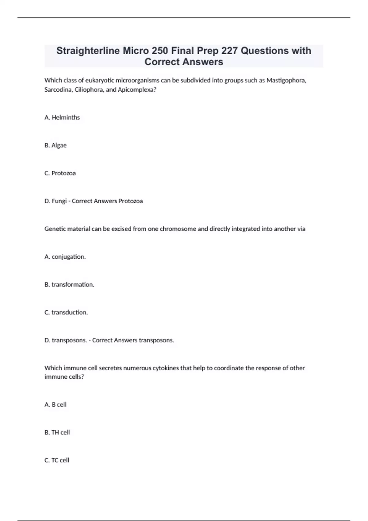 Straighterline Micro 250 Final Prep 227 Questions with Correct Answers Which class of eukaryotic microorganisms can be subdivided into groups such as Mastigophora, Sarcodina, Ciliophora, and Apicomplexa? A. Helminths B. Algae C. Protozoa D. Fungi - Correct Answers Protozoa Genetic material can be excised from one chromosome and directly integrated into another via A. conjugation. B. transformation. C. transduction. D. transposons. - Correct Answers transposons. Which immune cell secretes numerous cytokines that help to coordinate the response of other immune cells? A. B cell B. TH cell C. TC cell D. Platelets - Correct Answers TH cell Which of the following enzymes are used to amplify DNA during PCR? A. restriction endonuclease B. DNA polymerase
